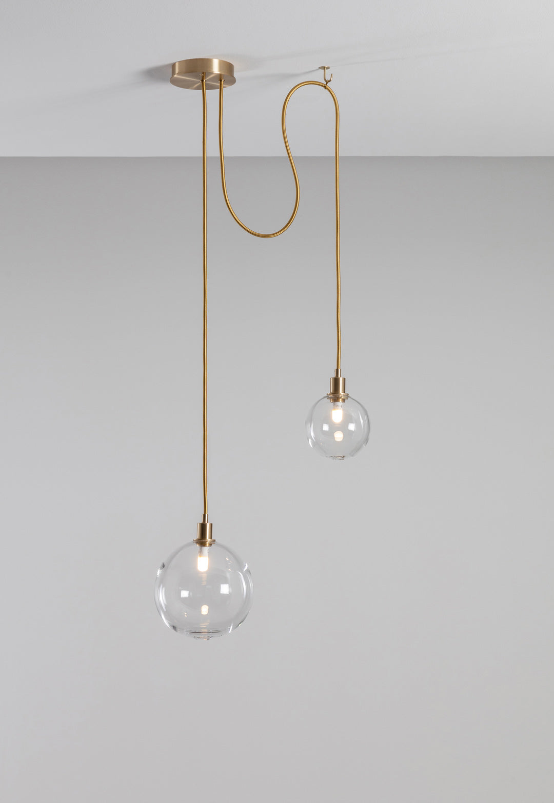 • Elegant Design: The central pendant hangs straight down from the canopy, while the outer pendant is swagged to a ceiling hook, creating an elegant interplay of form and space.