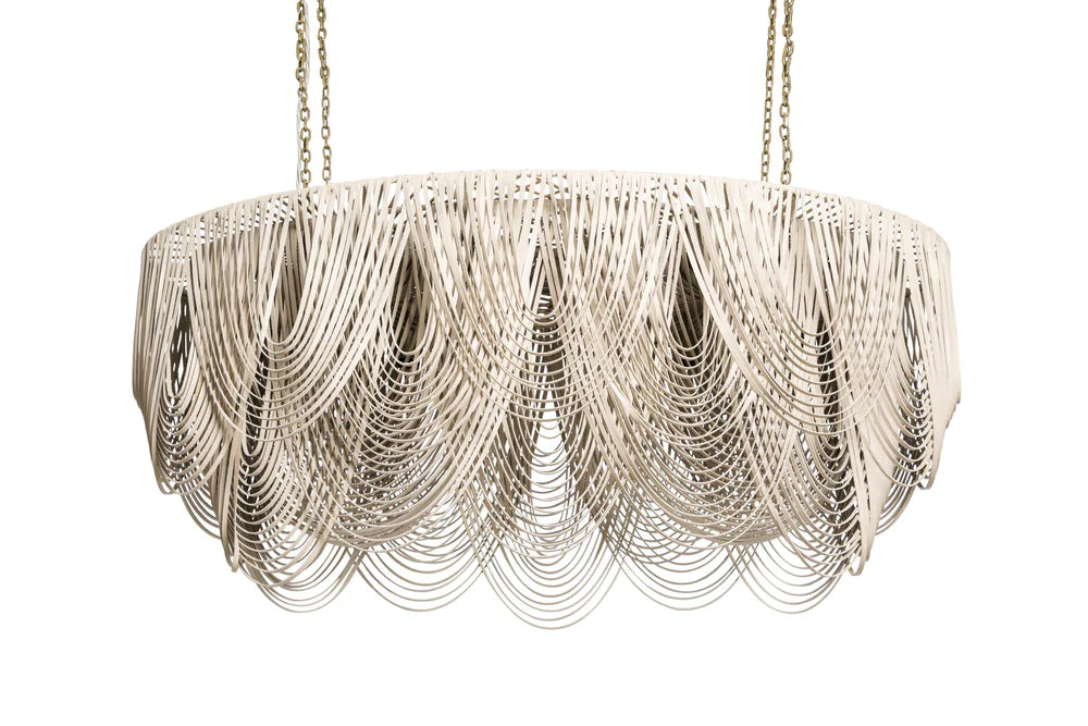 Elevate your interiors with the dramatic elegance of the Medium Oval Leather Whisper Chandelier - Whispered luxury in light, draped in leather.