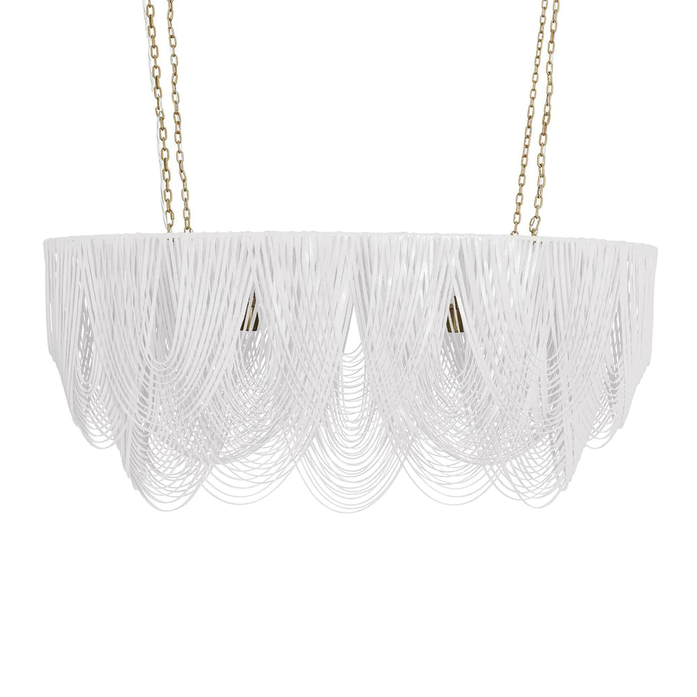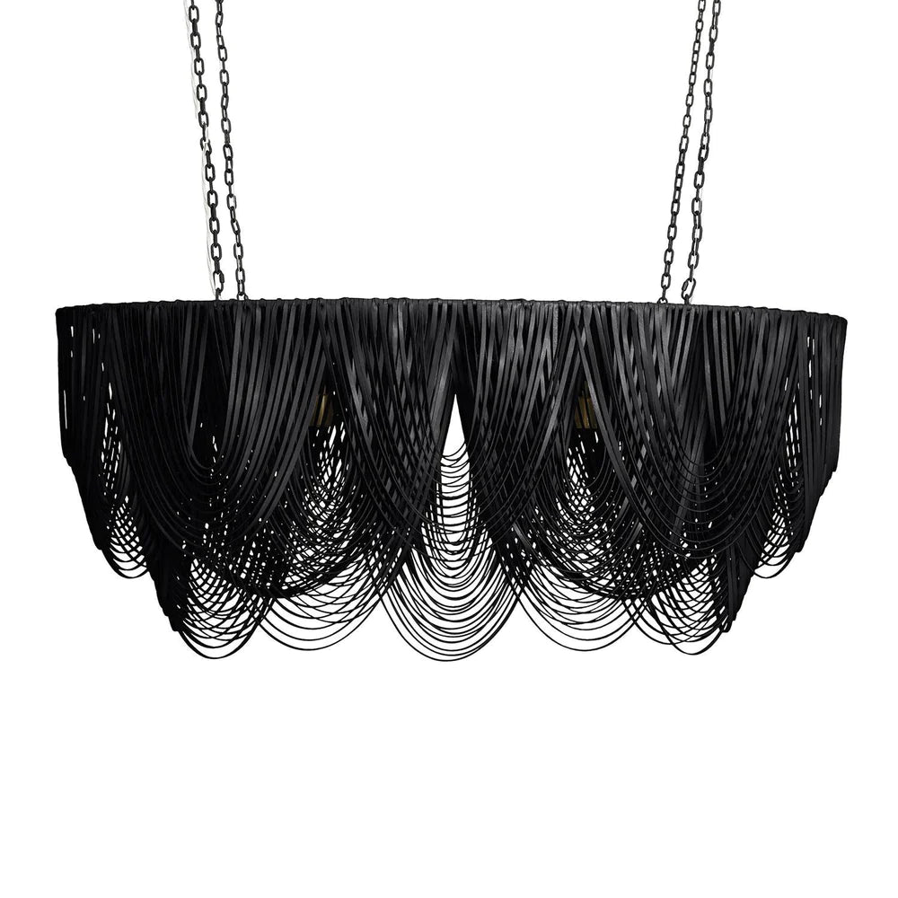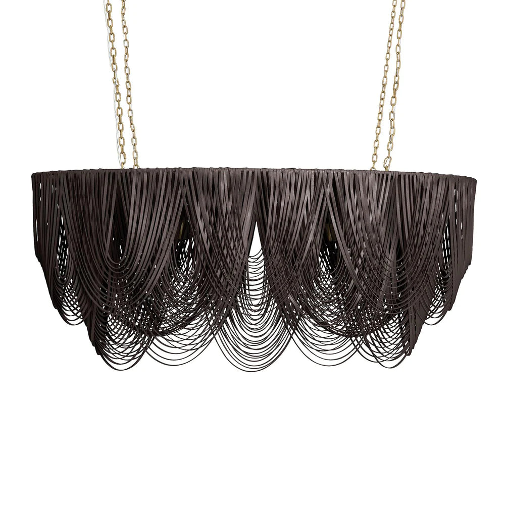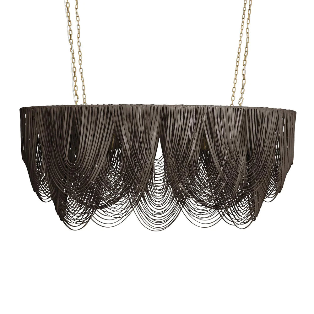 Elevate your interiors with the dramatic elegance of the Medium Oval Leather Whisper Chandelier - Whispered luxury in light, draped in leather.