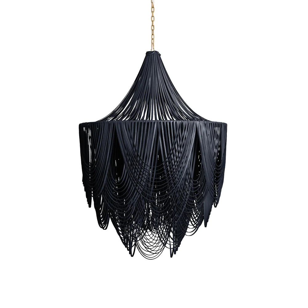 Elevate your interiors with the dramatic elegance of the Large Round Leather Whisper Chandelier - Whispered luxury in light, draped in leather.
