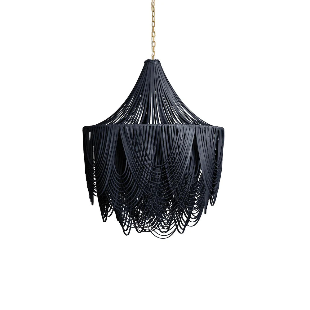 Elevate your interiors with the dramatic elegance of the Medium Round Leather Whisper Chandelier - Whispered luxury in light, draped in leather.