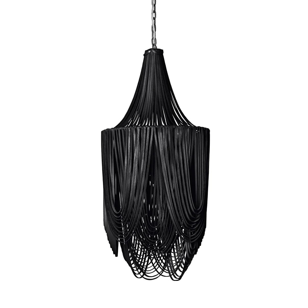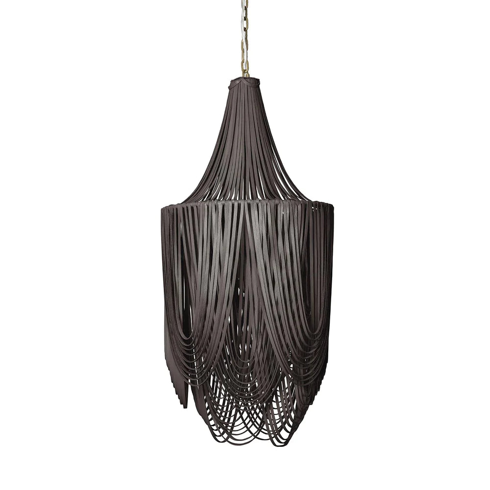 Elevate your interiors with the dramatic elegance of the Small Round Leather Whisper Chandelier - Whispered luxury in light, draped in leather.