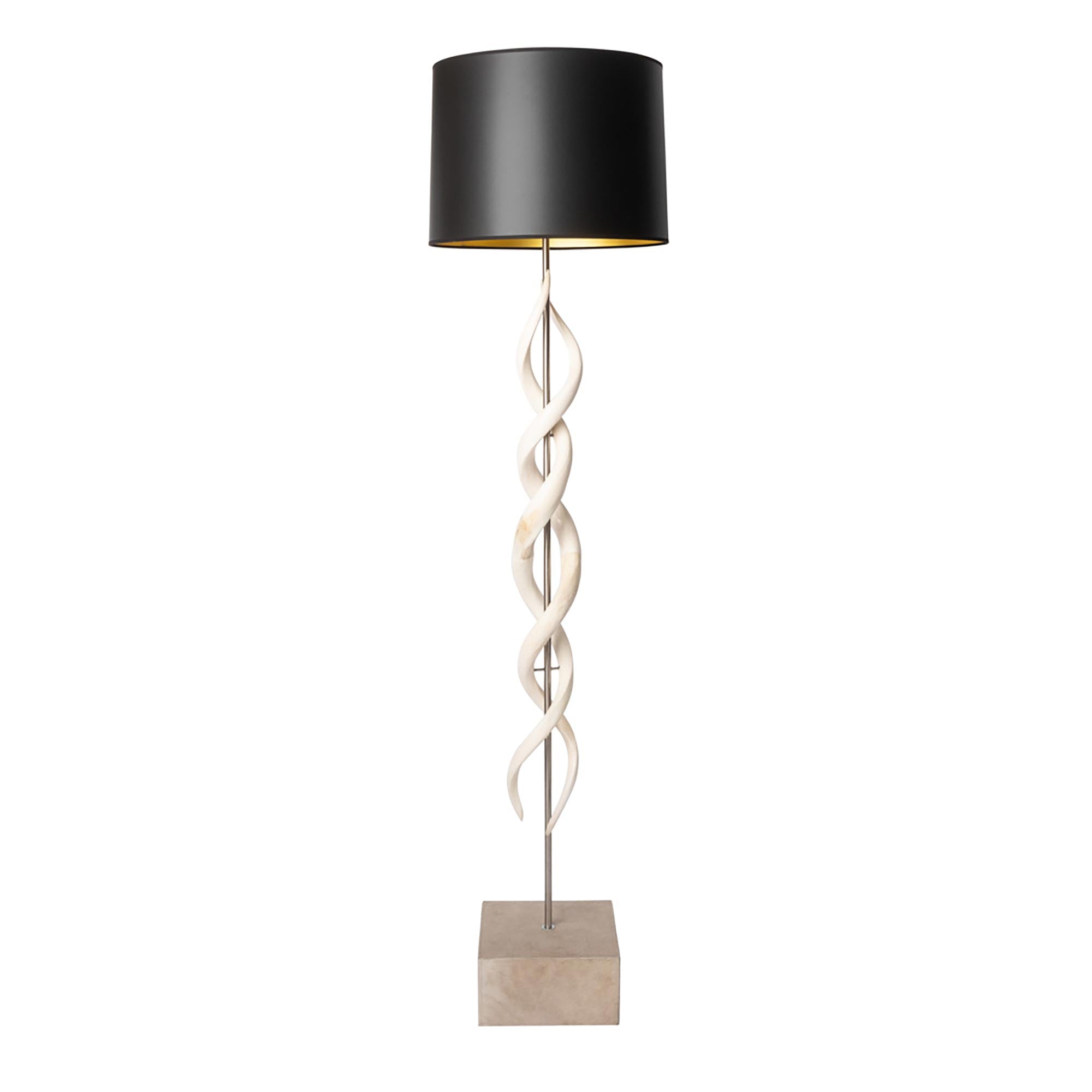 Handcrafted in South Africa, this naturally elegant floor lamp features four intertwined African kudu inner horns that appear to be suspended above the wooden base, which is wrapped in top-stitched hair-on cowhide. A shade of your choice, black or cream, completes this design. All hide and horn has been sustainably sourced as an agricultural byproduct.
