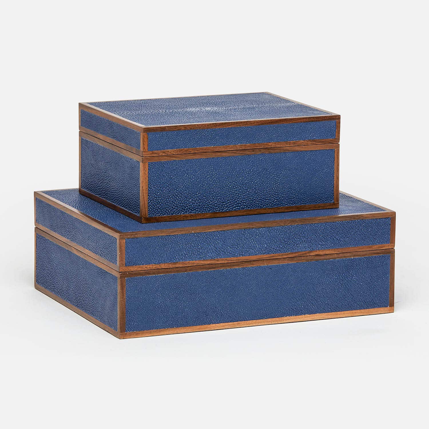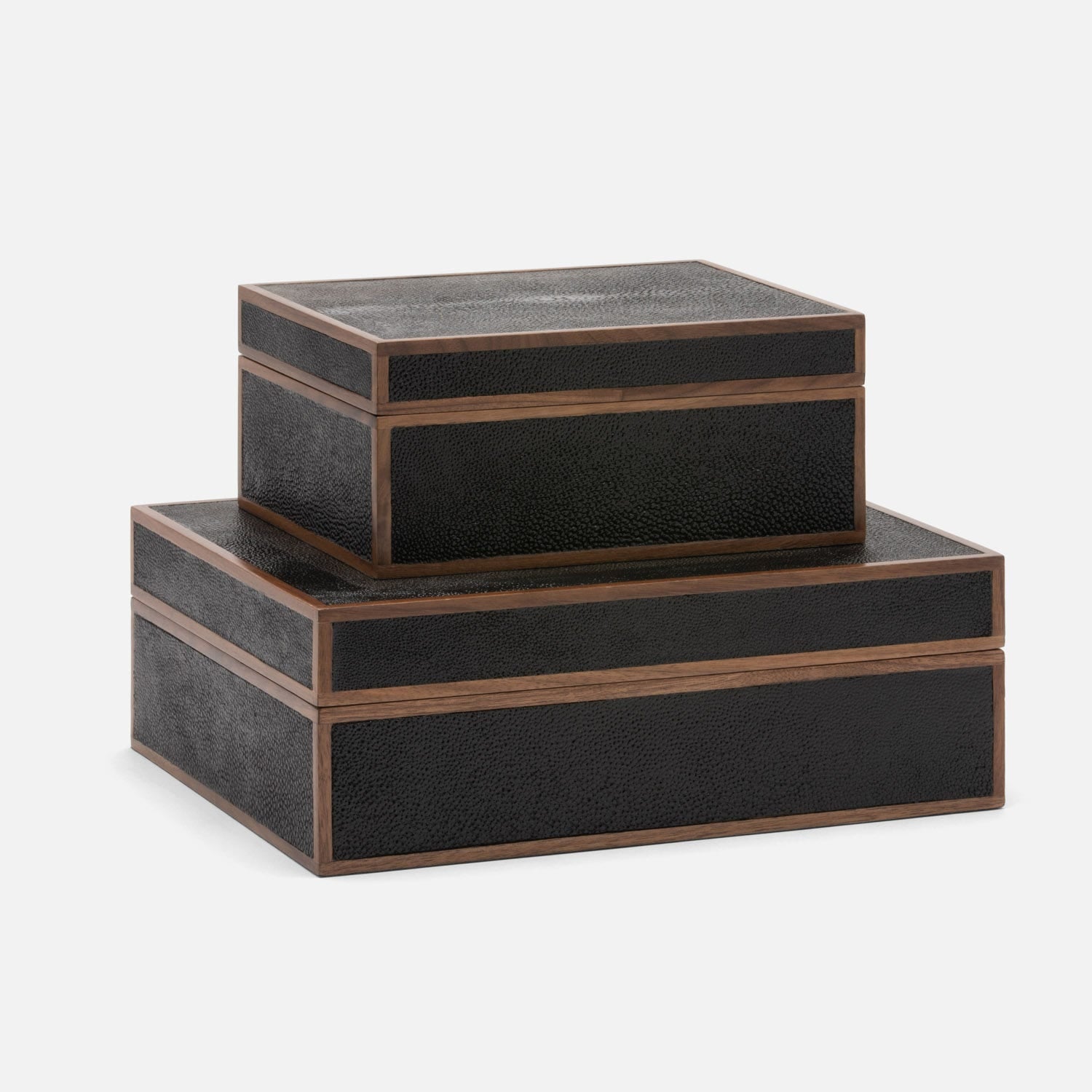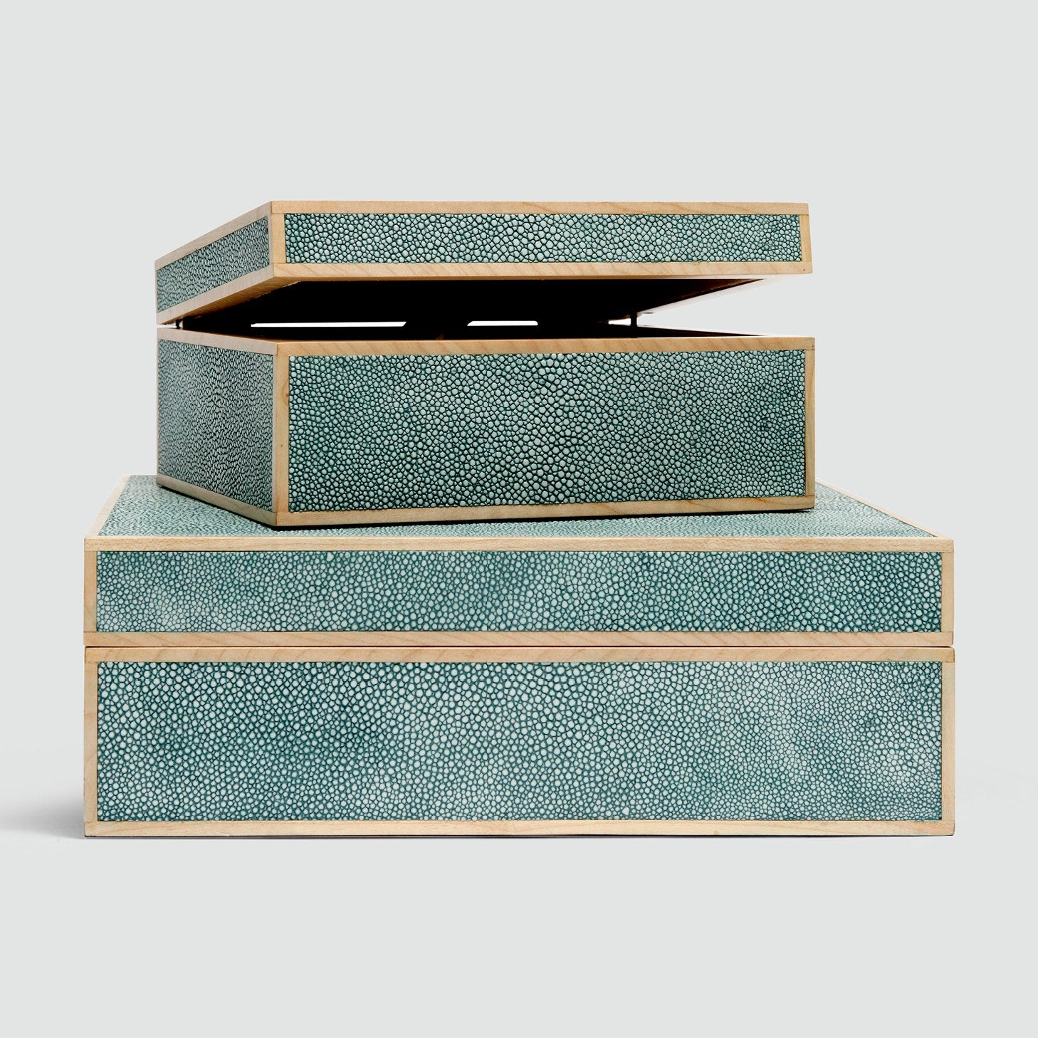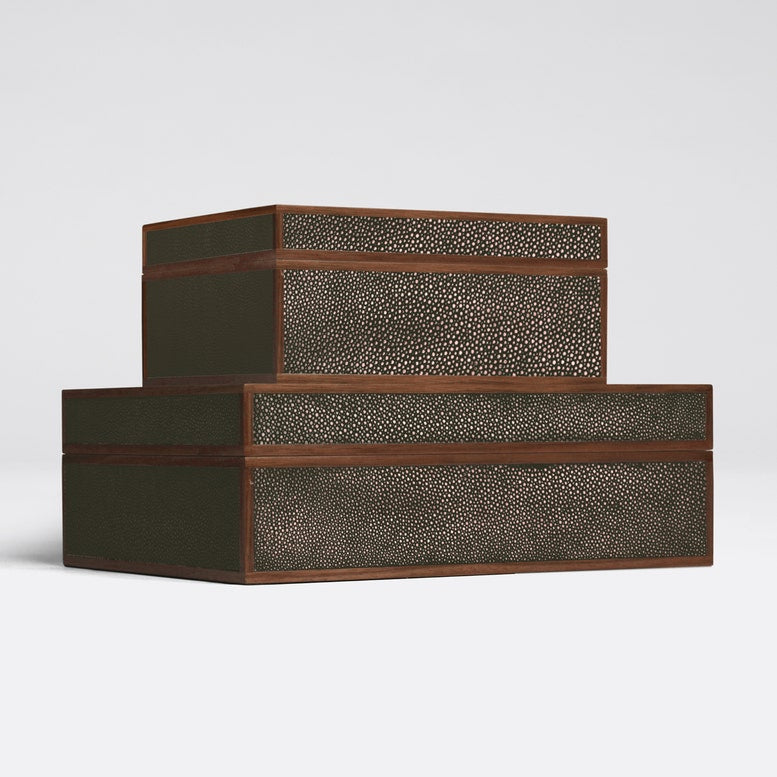 💡 Design and Material: Each box features a luxurious faux shagreen exterior, meticulously crafted to mimic the texture of authentic shagreen, exuding sophistication and elegance. The addition of finely trimmed wood accents adds warmth and depth to the sleek silhouette, creating a harmonious balance between modernity and timeless charm. Available in a set of two with varying dimensions and nine color finish options, these boxes offer versatility to complement any interior style.