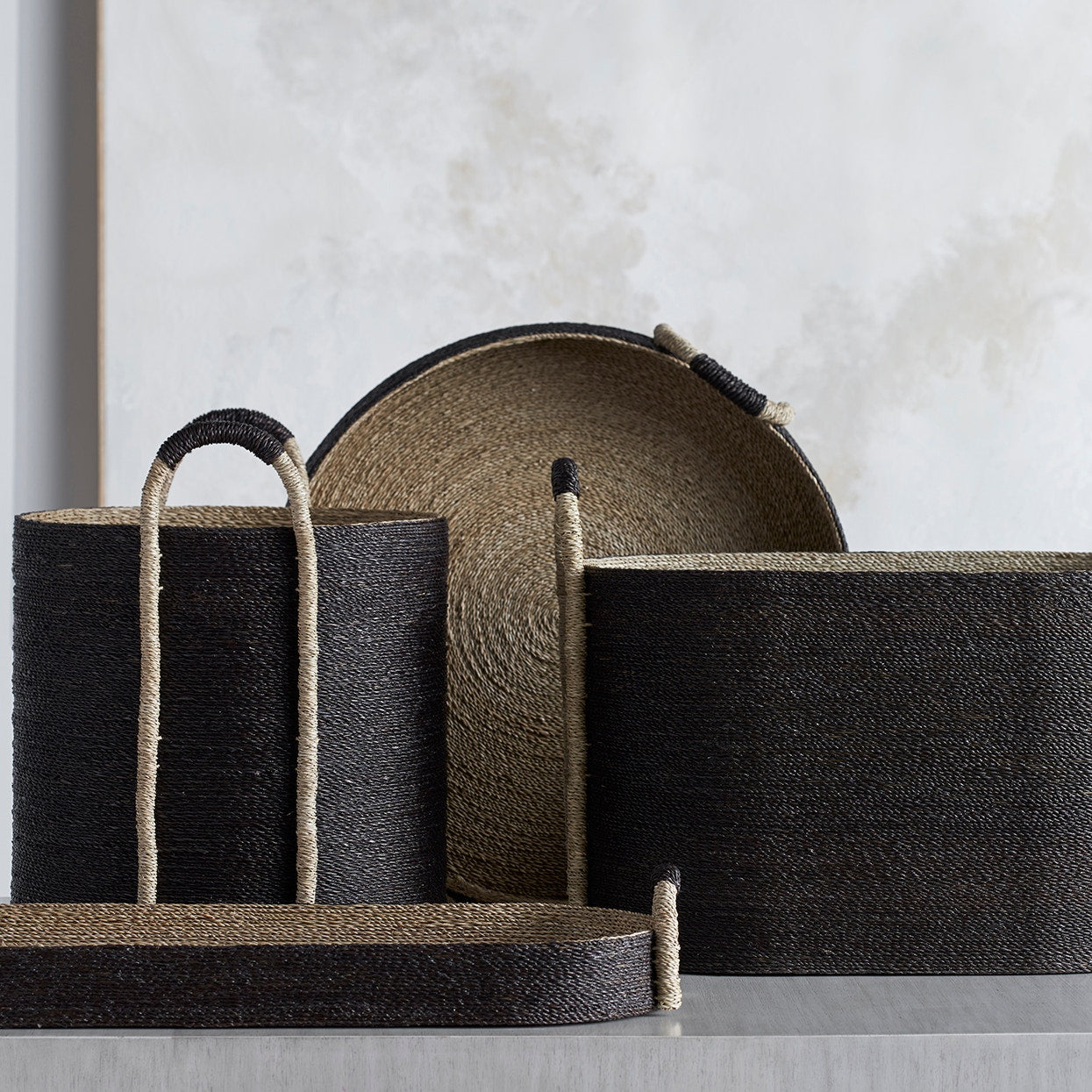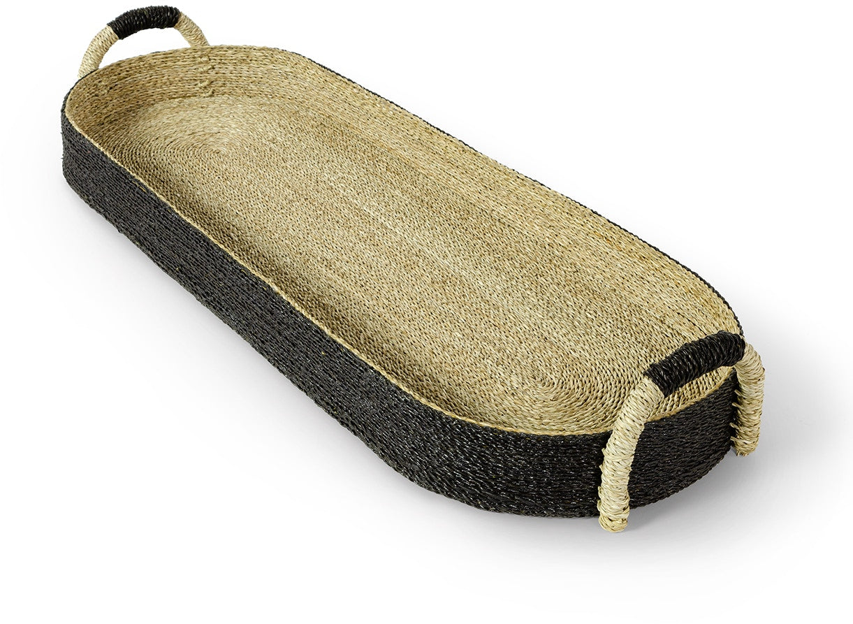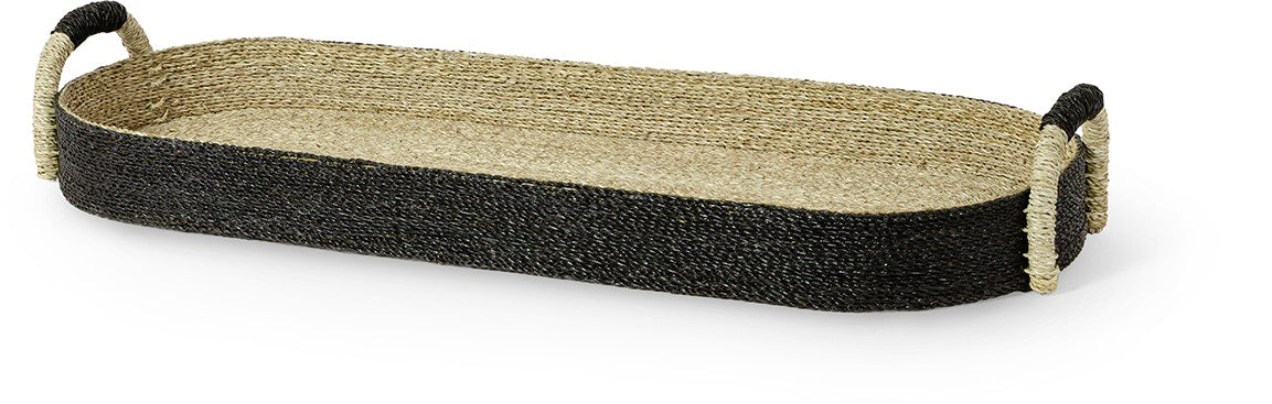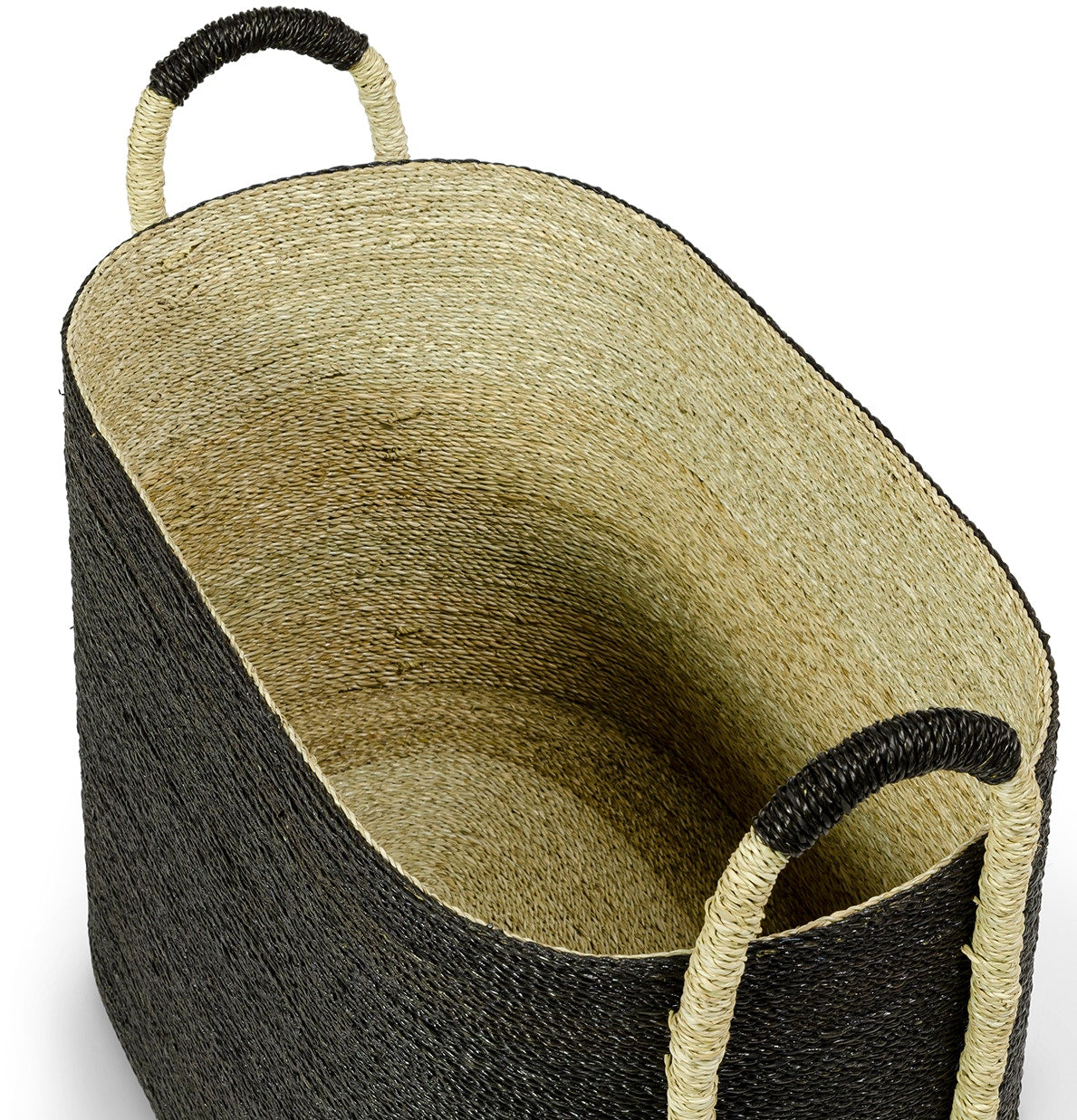 š”Design and Materials: Features a double wall design crafted from hand-woven natural seagrass on the inside and black-grey dyed seagrass on the outside. It includes a hard coat glaze for durability and shape retention, complemented by large contrasting handles for easy transport.
