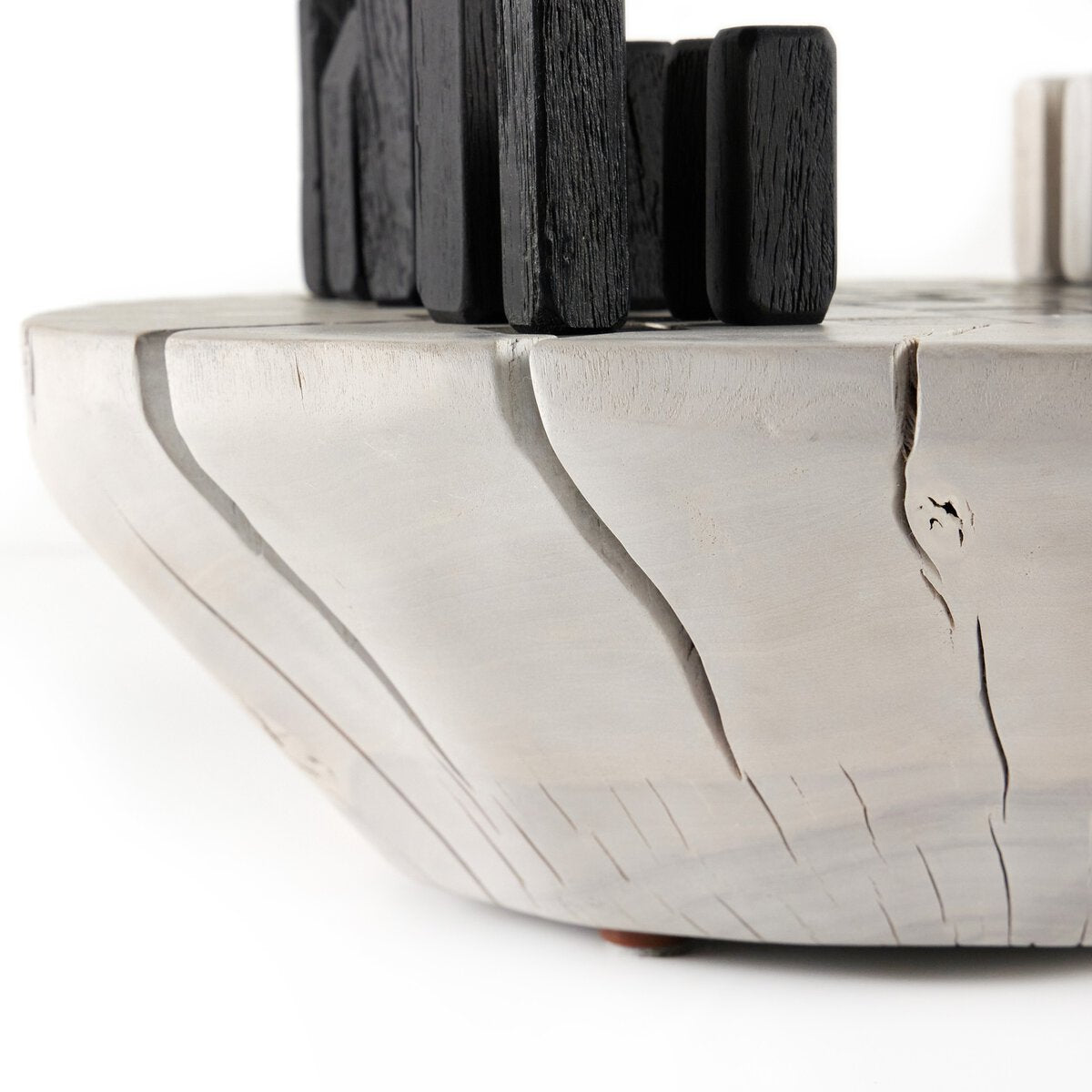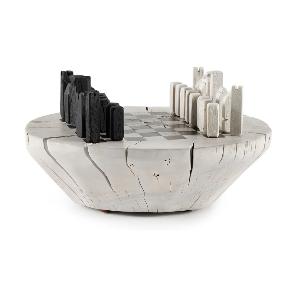 Introducing the Modern Chess Set - Ivory. This expertly crafted chess set features a tabletop board and pieces carved from solid wood remnants, maximizing material usage and reducing waste. Made by a family-run factory in Mexico, this set is both elegant and sustainable.