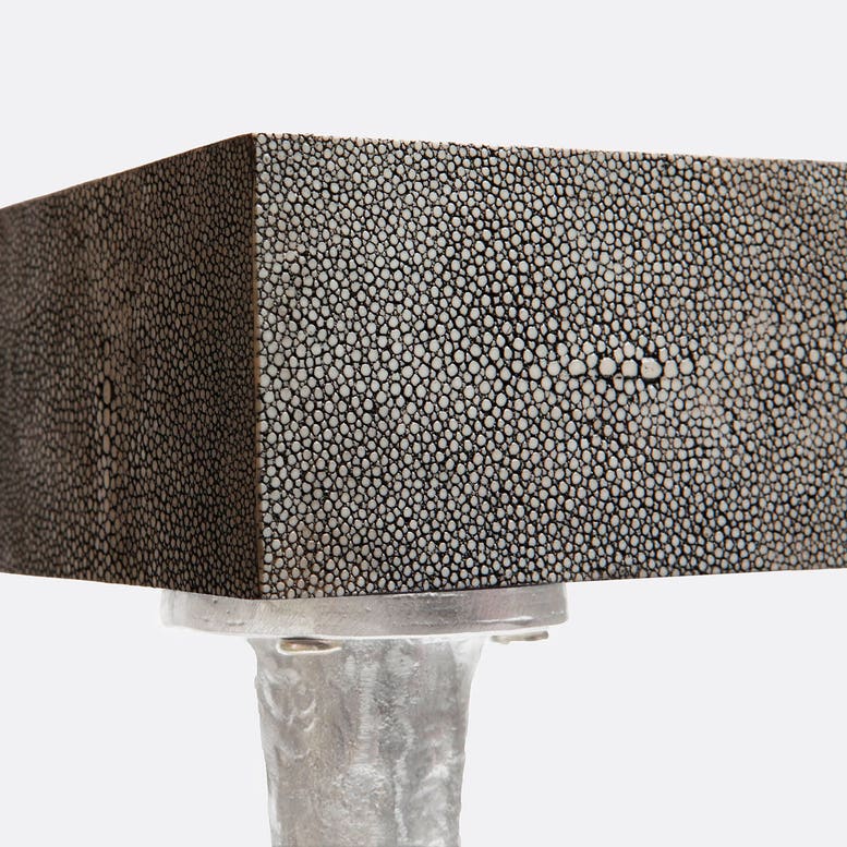 💡Design and Materials: A minimalist silhouette elevated by tactile finishes, the Audrey pairs a waxed-linen or faux shagreen surface with organically textured metal legs and hardware.