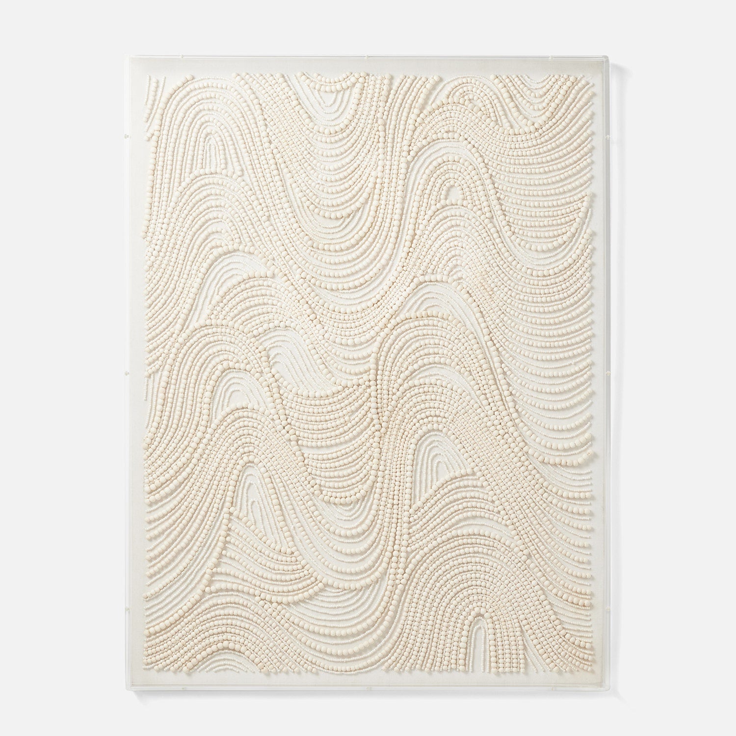 💡Design and Materials: A stunning piece of art characterized by its elegant design and high-quality materials. The design features undulating waves created from matte wood and pearlescent white glass beads, meticulously hand-beaded onto a simple white canvas. The combination of these materials adds both neutral versatility and a touch of glamour to the artwork. To preserve its beauty and durability, the entire piece is encased in clear acrylic, adding a contemporary touch while ensuring longevity.