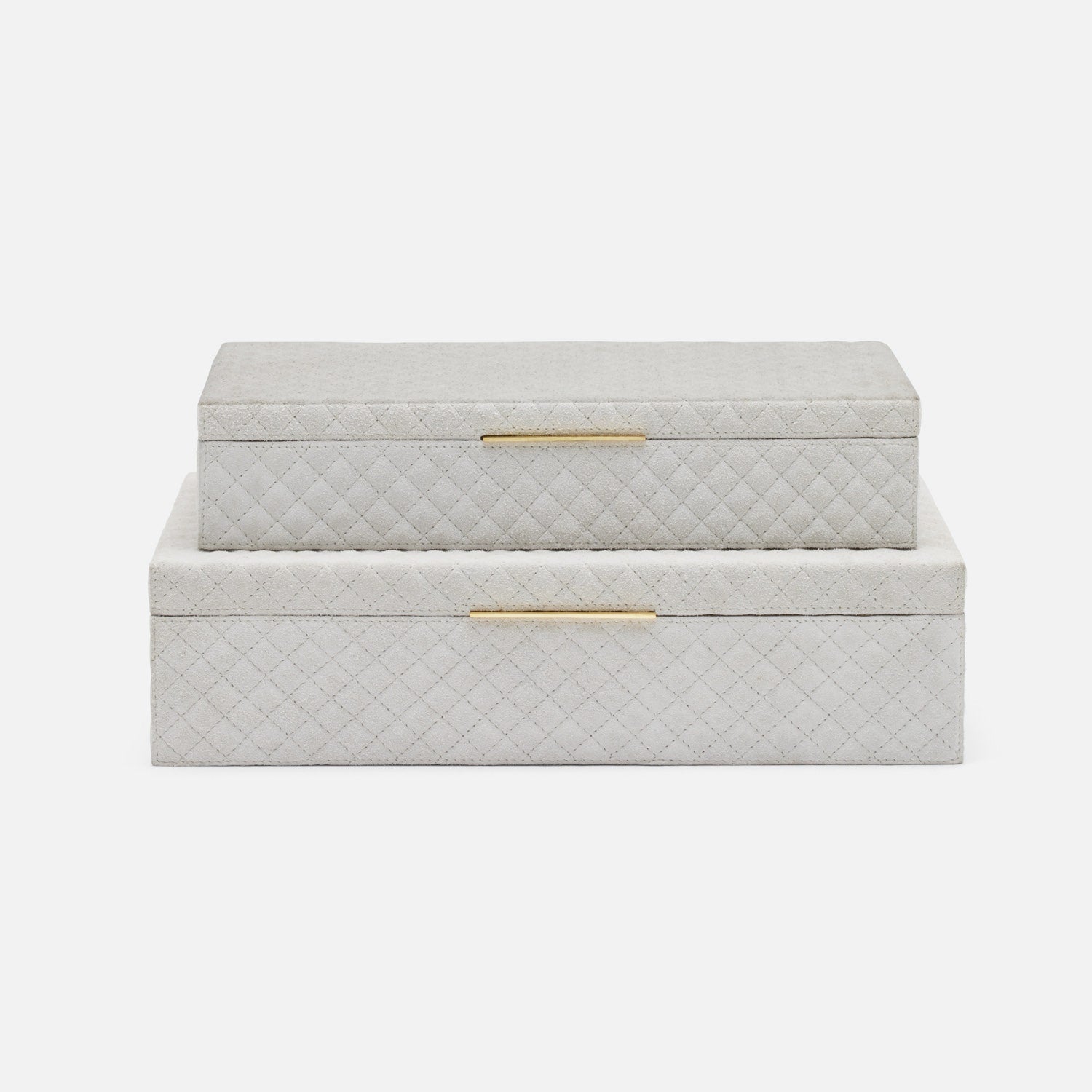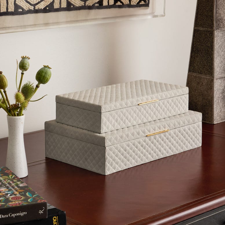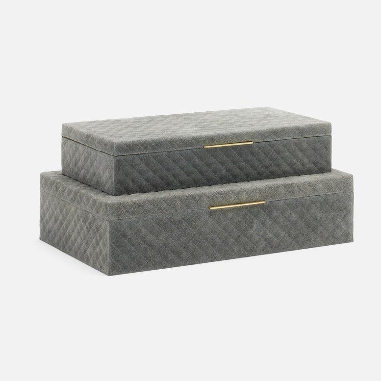 💡 Design and Material: These meticulously crafted boxes are enveloped in velvety, crosshatch-quilted suede, providing a tactile indulgence that's unmatched. Each box is carefully lined with chambray, adding an element of refinement to its interior. Sold as a set of two, the Bower Box Set presents versatility in storage options with varying dimensions. Choose from two available color finishes to suit your style preferences.