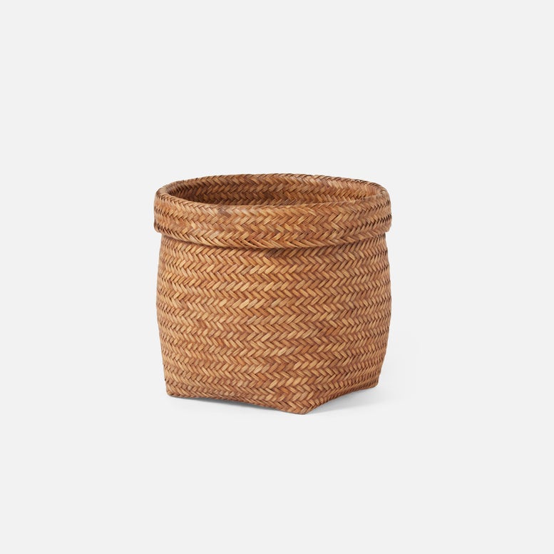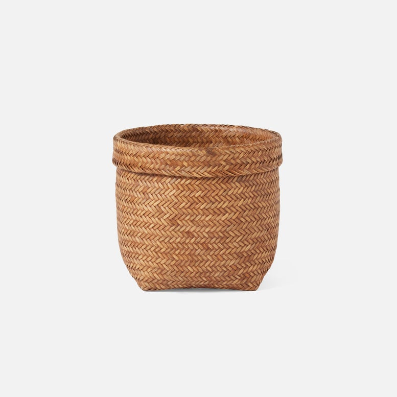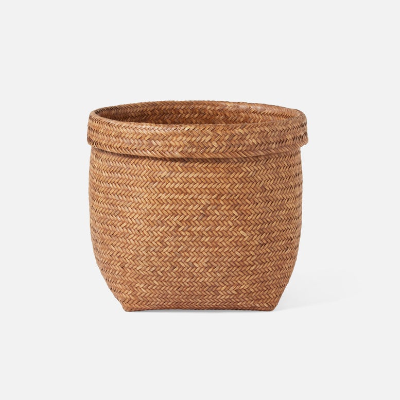 💡 Design and Material: Handcrafted from split rattan in a flat-weave style, it exudes elegance with a touch of rustic charm. Its rounded top, folded trim, and squared bottom create a captivating silhouette, while the chevron woven pattern, finished in umber glaze, adds a dash of sophistication.