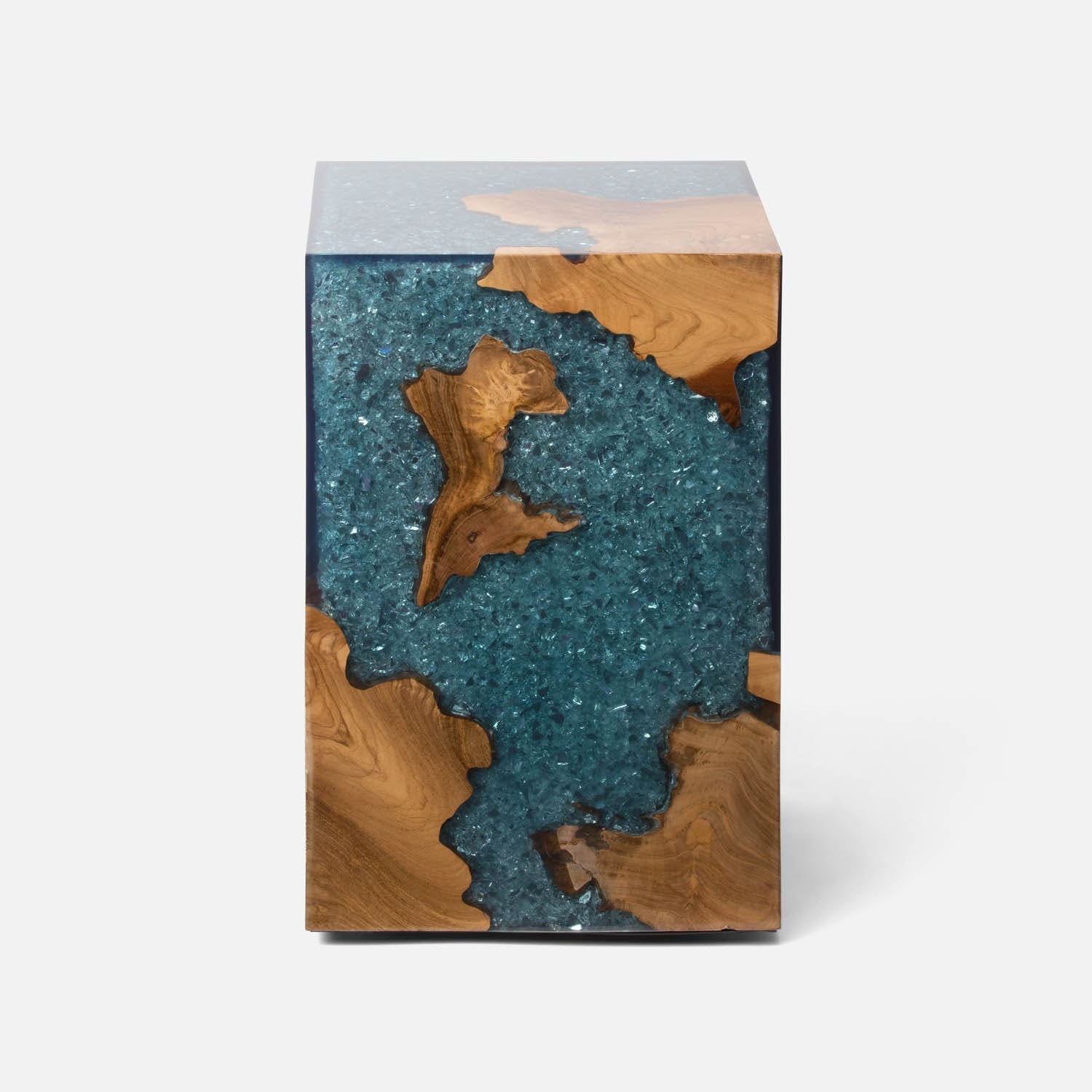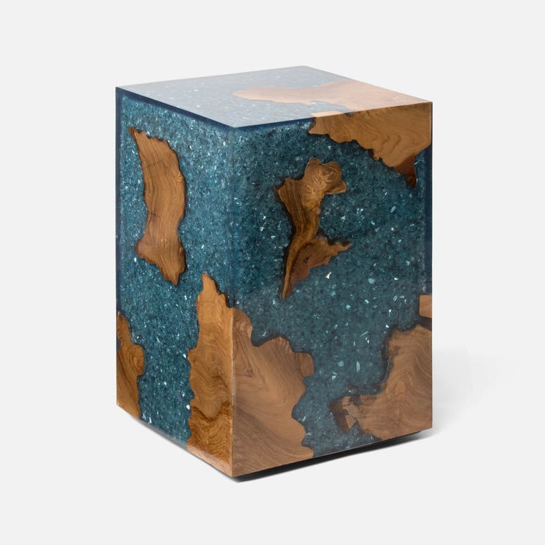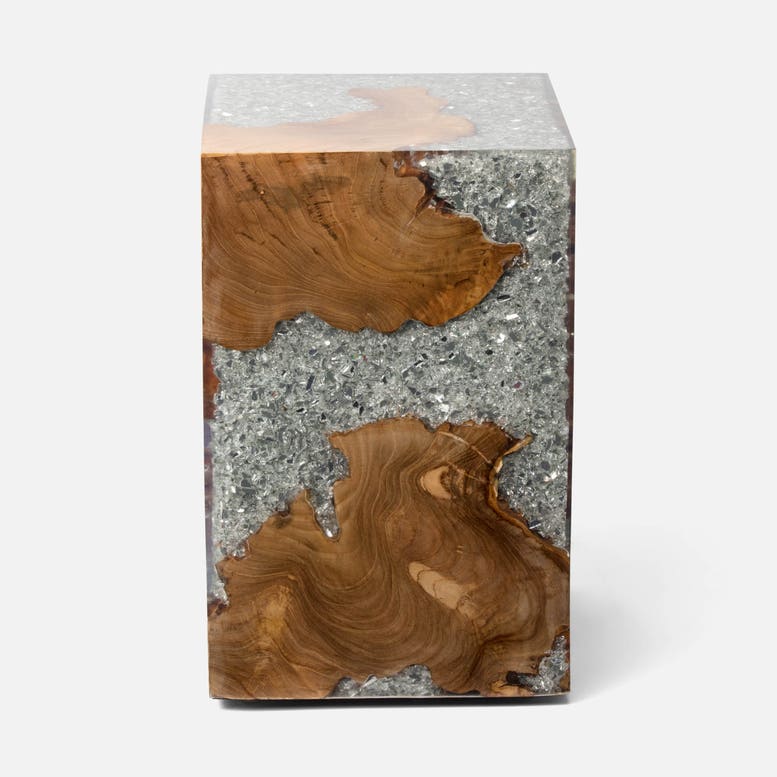💡Design and Materials: Expertly crafted from solid teak and resin embedded with glass shards, the stool combines natural wood grain with radiant color depth, balancing organic texture and modern elegance.