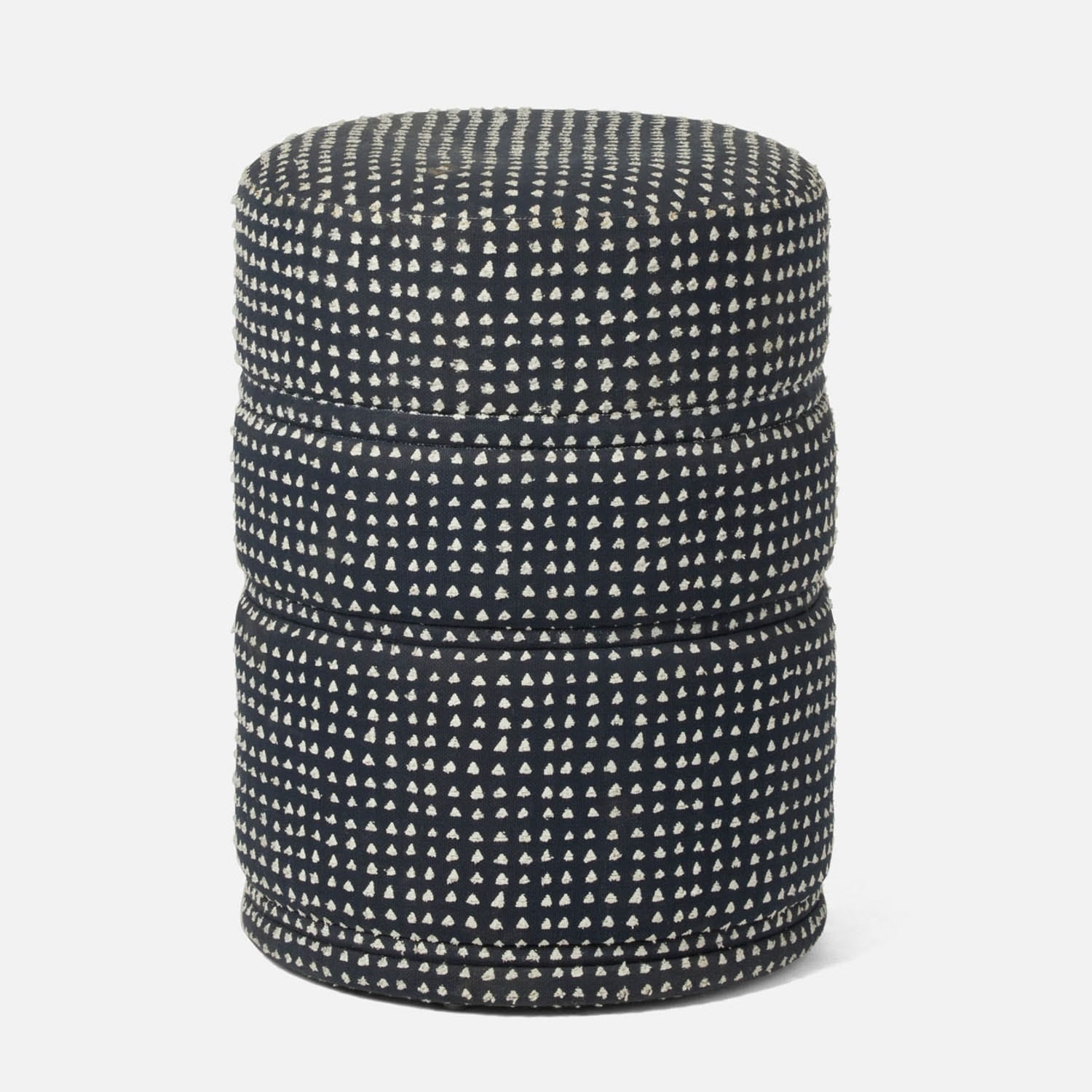 💡Design and Materials: Crafted with a slim frame and wrapped in distressed navy cotton, the stool’s hand-stitched white triangles lend a lively, artisanal character to its minimalist design.