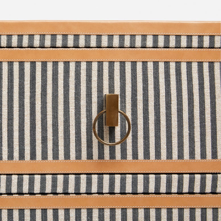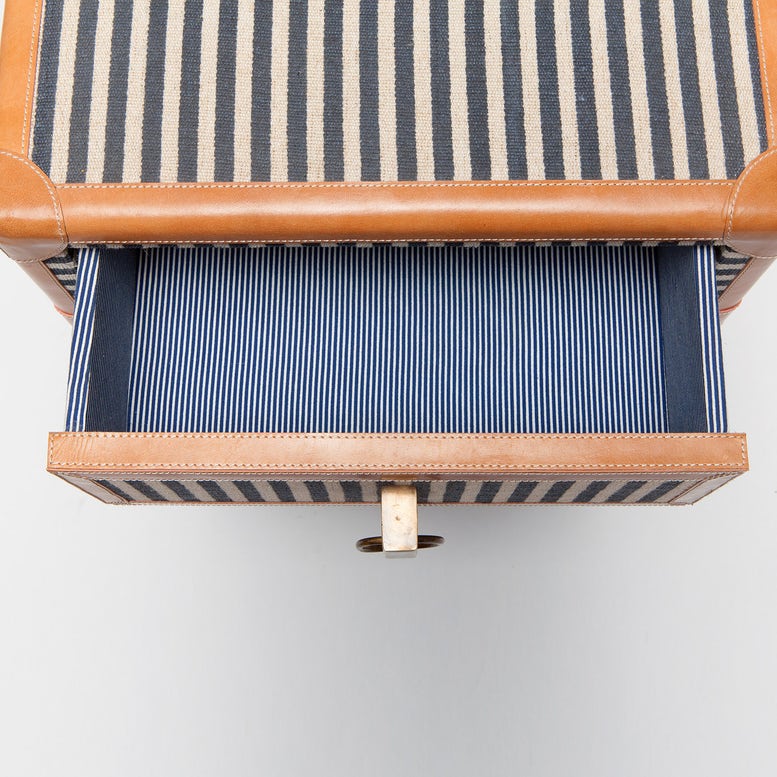 Elegant Finish: Finished in the captivating combination of BLUE STRIPED JUTE and AGED CAMEL FULL-GRAIN LEATHER, the nightstand exudes an air of casual refinement and timeless elegance.