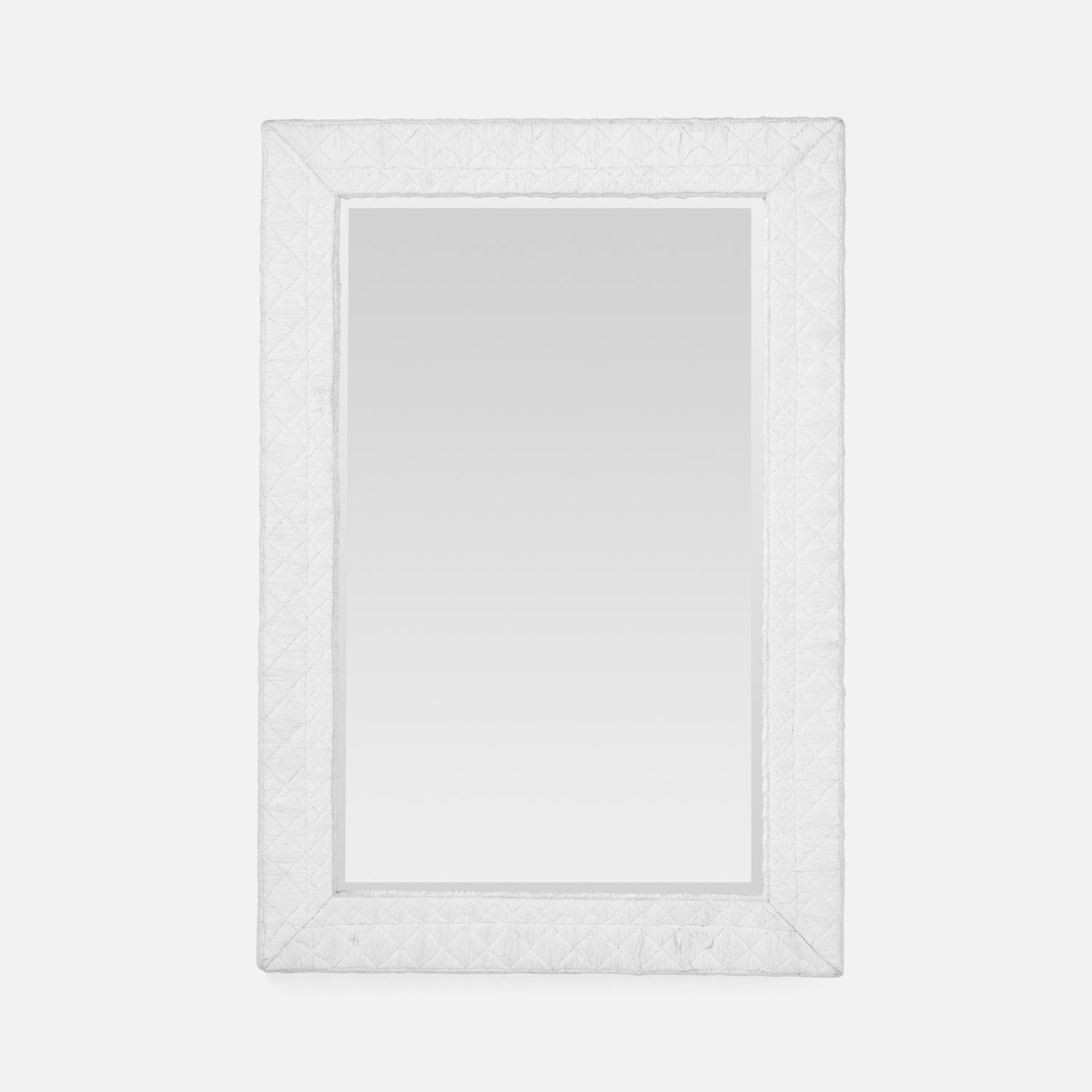 π Description: Elevate your space with the triumph of technique embodied in the Farrimond Mirror from Made Goods. A closer look reveals the exquisite quilted texture achieved with hand-woven flat-weave rattan in a bleached white finish. This mirror seamlessly combines craftsmanship and design, making it a distinctive and artisanal addition to your decor.