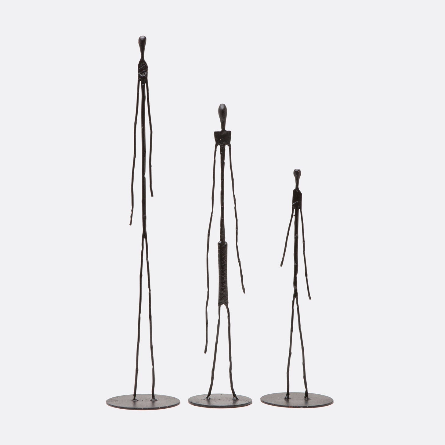 💡 Design and Material: Presents a mesmerizing collection of elongated human figures, meticulously crafted from welded wire with intricate details that captivate the eye. Each sculpture stands as a unique expression of form and motion, subtly differing from its counterparts, yet collectively forming a harmonious ensemble. Sold in two sets of three, each with distinct dimensions, these sculptures invite viewers to explore the interplay of space and dimensionality.