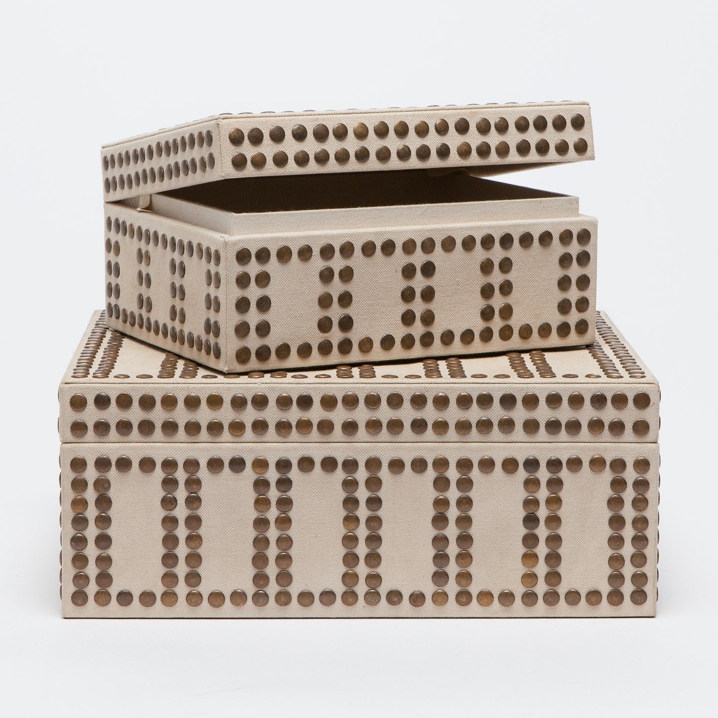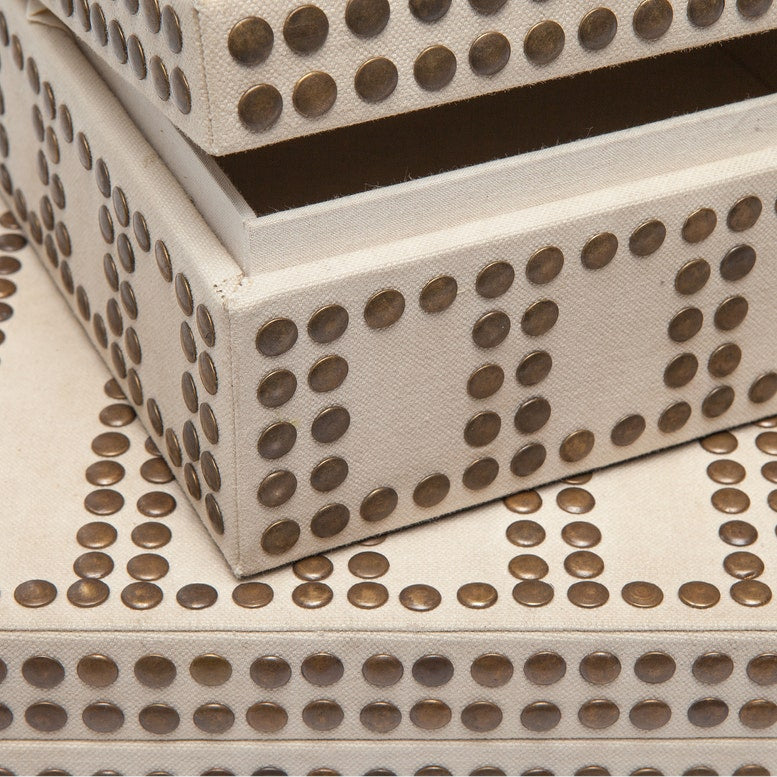 💡 Design and Material: Crafted with brass studs arranged in a modern interpretation of a geometric, Greek-inspired pattern, these boxes bring a touch of sophistication to your storage needs. Plus, their recycled canvas construction speaks to a commitment to sustainability. Inside, coordinating lining adds to their polished appeal. Sold as a set of two with varying dimensions.
