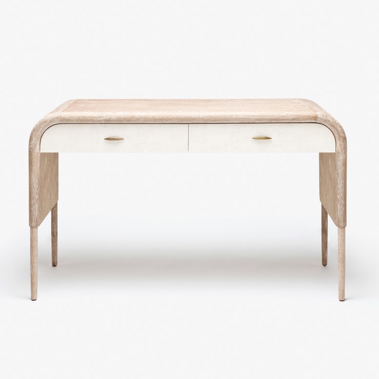 📍 Versatile Placement: The Pierre pairs a soft, rounded oak frame in a whitewashed finish with textured faux shagreen panels, highlighting the wood’s natural grain and midcentury-inspired tapering legs.