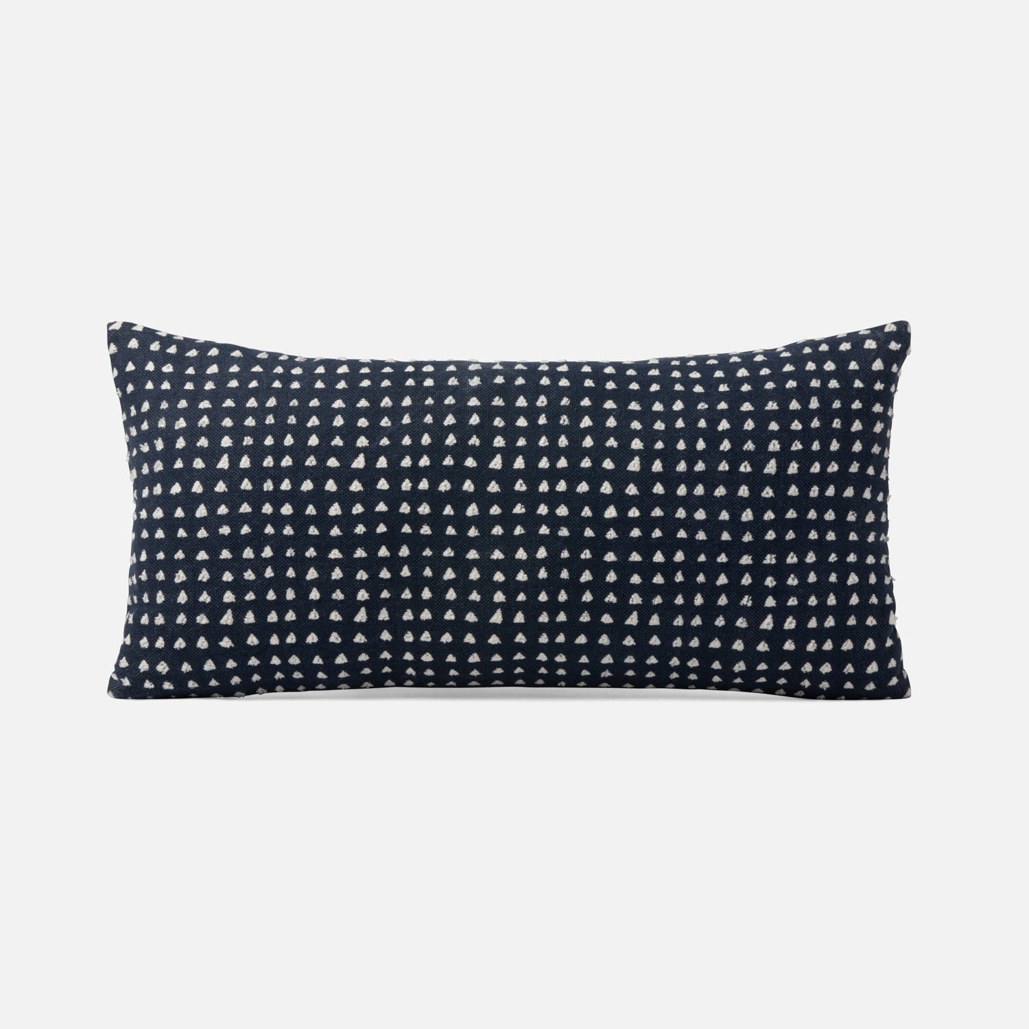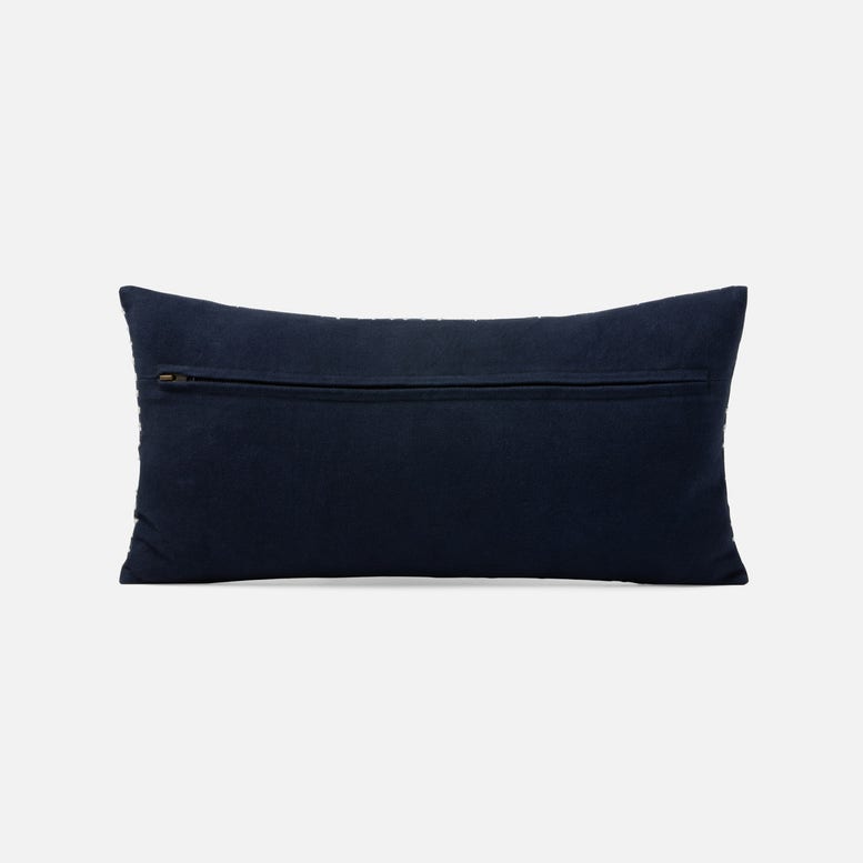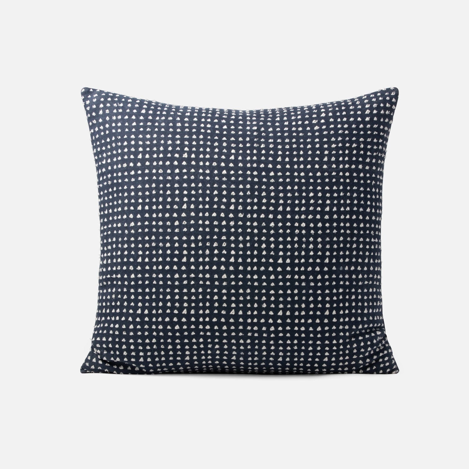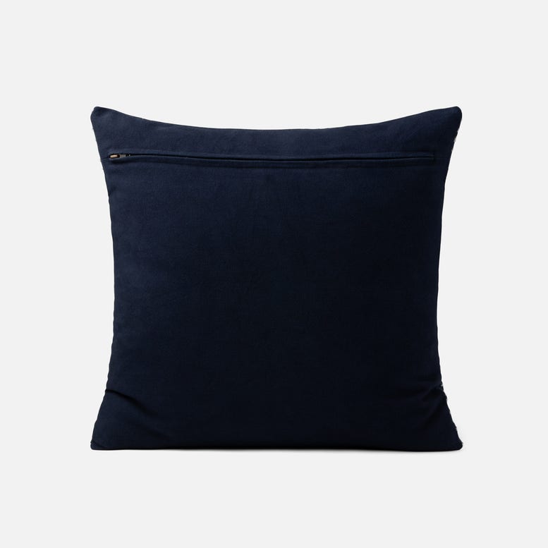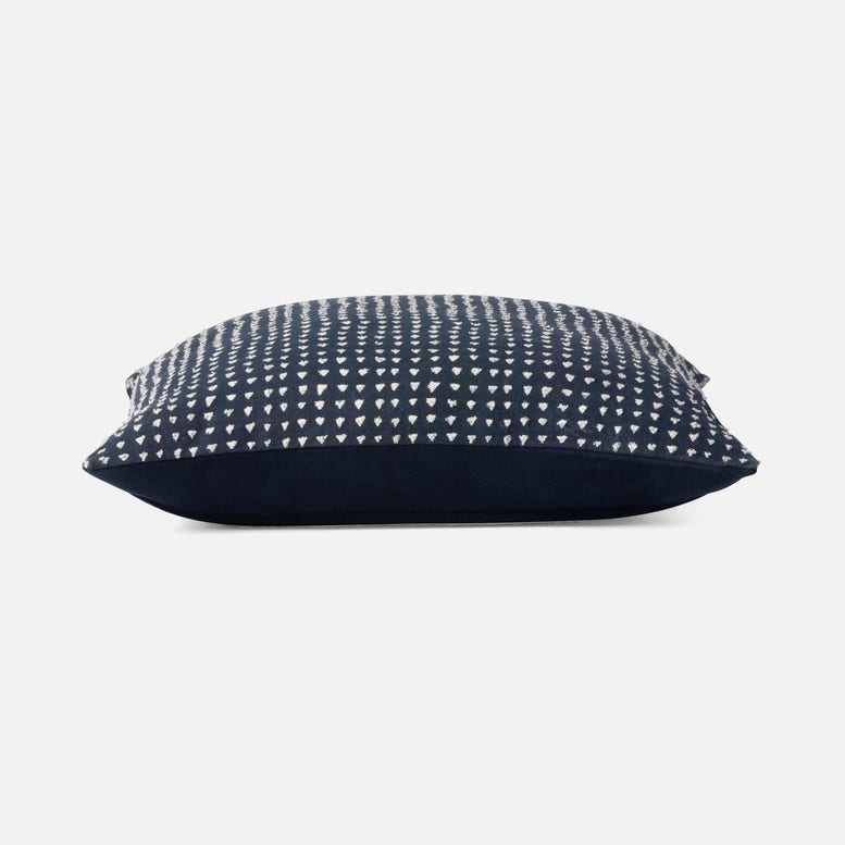 Playful Polka Dot Accents: Hand-sewn white polka dots adorn the navy canvas fabric, creating a whimsical contrast and adding a touch of charm to the pillow's design.
