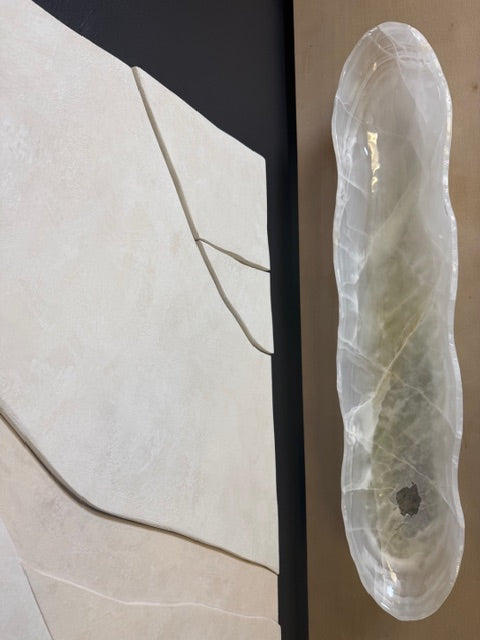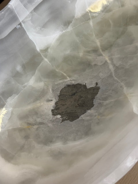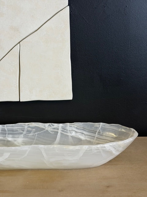 Sculpted from rare Mexican fossil onyx, the Cristalino Onyx Canoe Bowl is a striking expression of nature’s artistry. Its elongated, organic form reveals layered translucency in soft white and grey tones, accented by natural mineral inclusions that create depth and character.