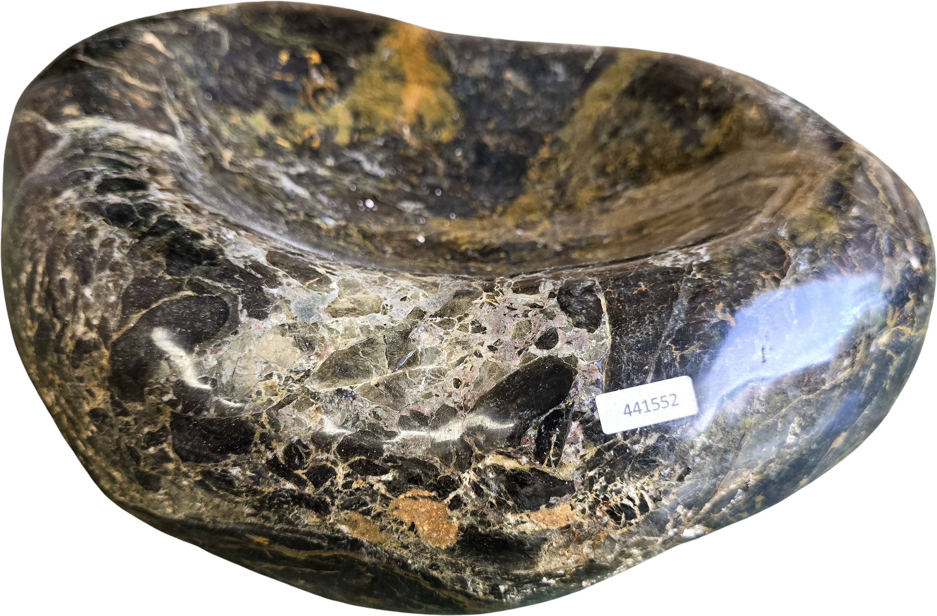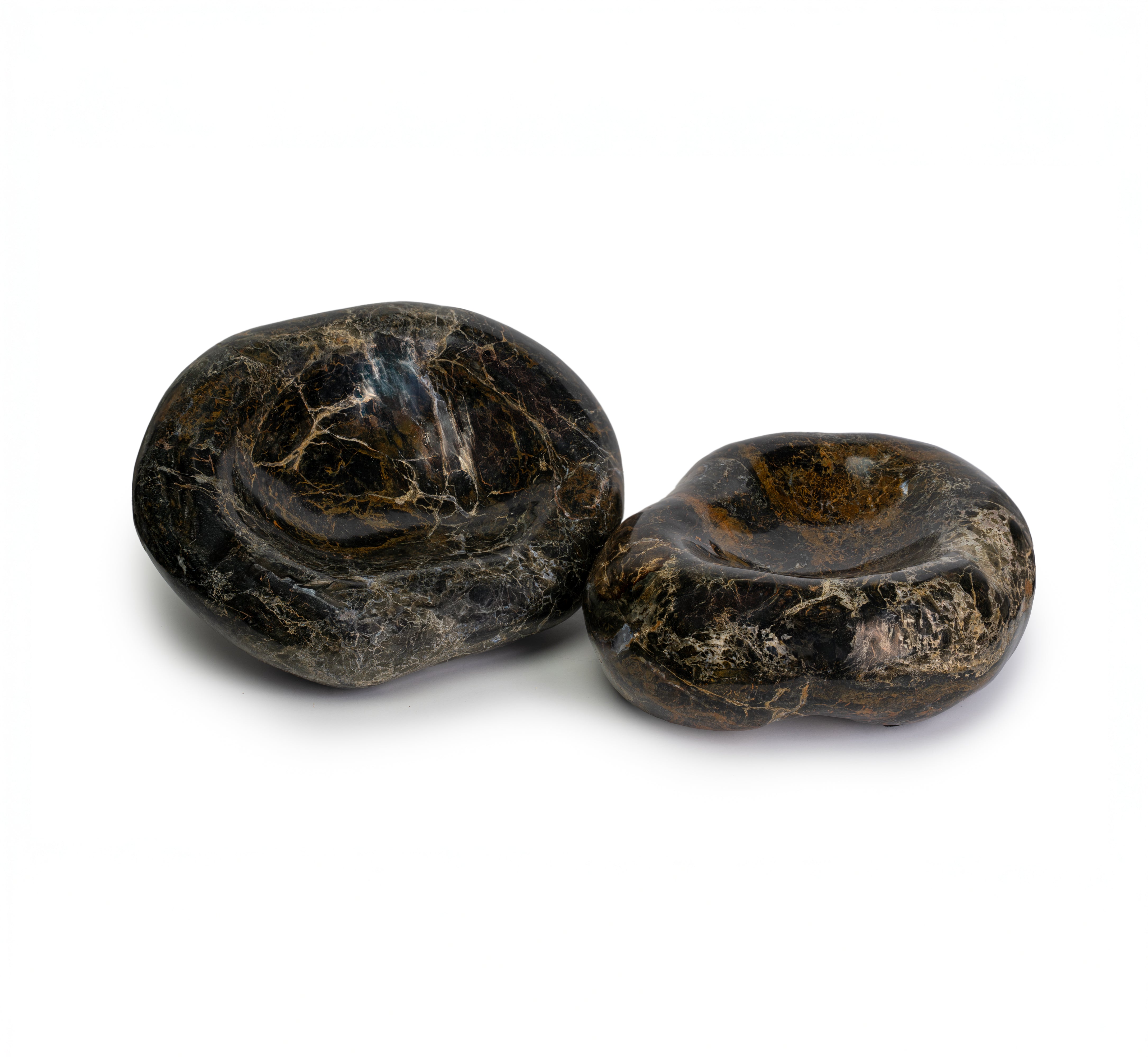 Its smooth, rounded silhouette and subtle central dip make it a striking catchall for small treasures or a standalone sculptural accent. Crafted from solid stone and polished to a high sheen, this bowl adds grounding energy and natural beauty to any shelf, console, or tabletop display.