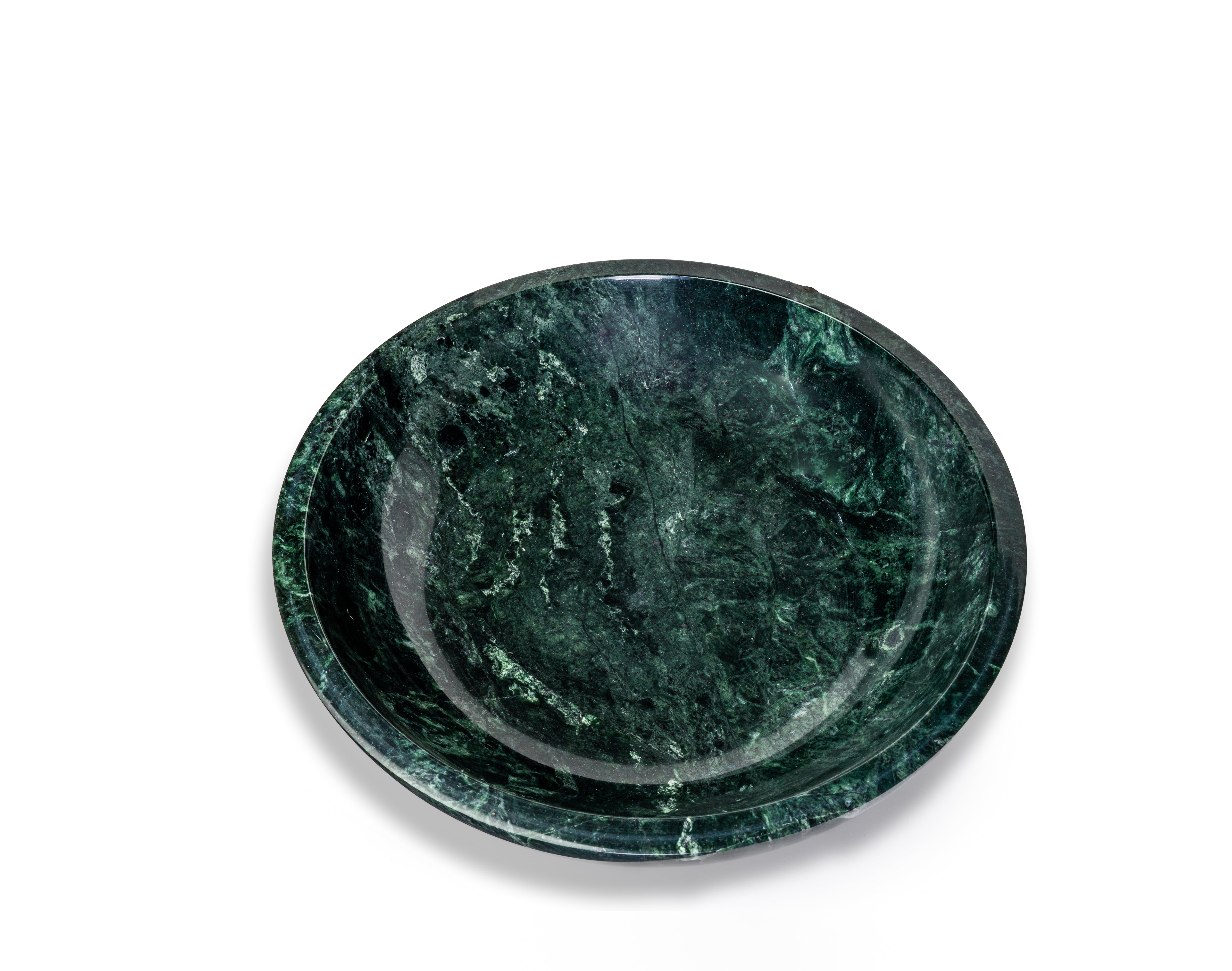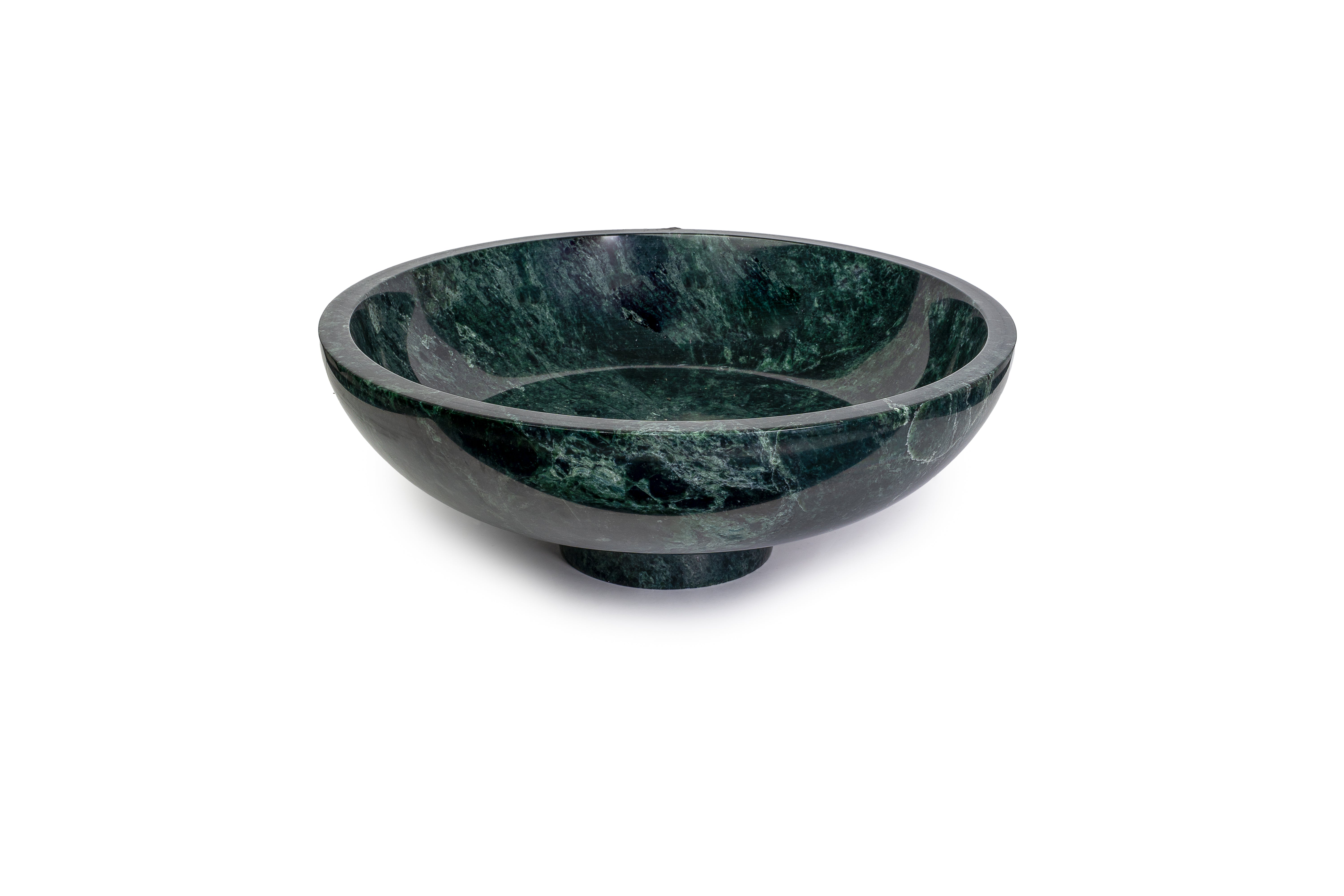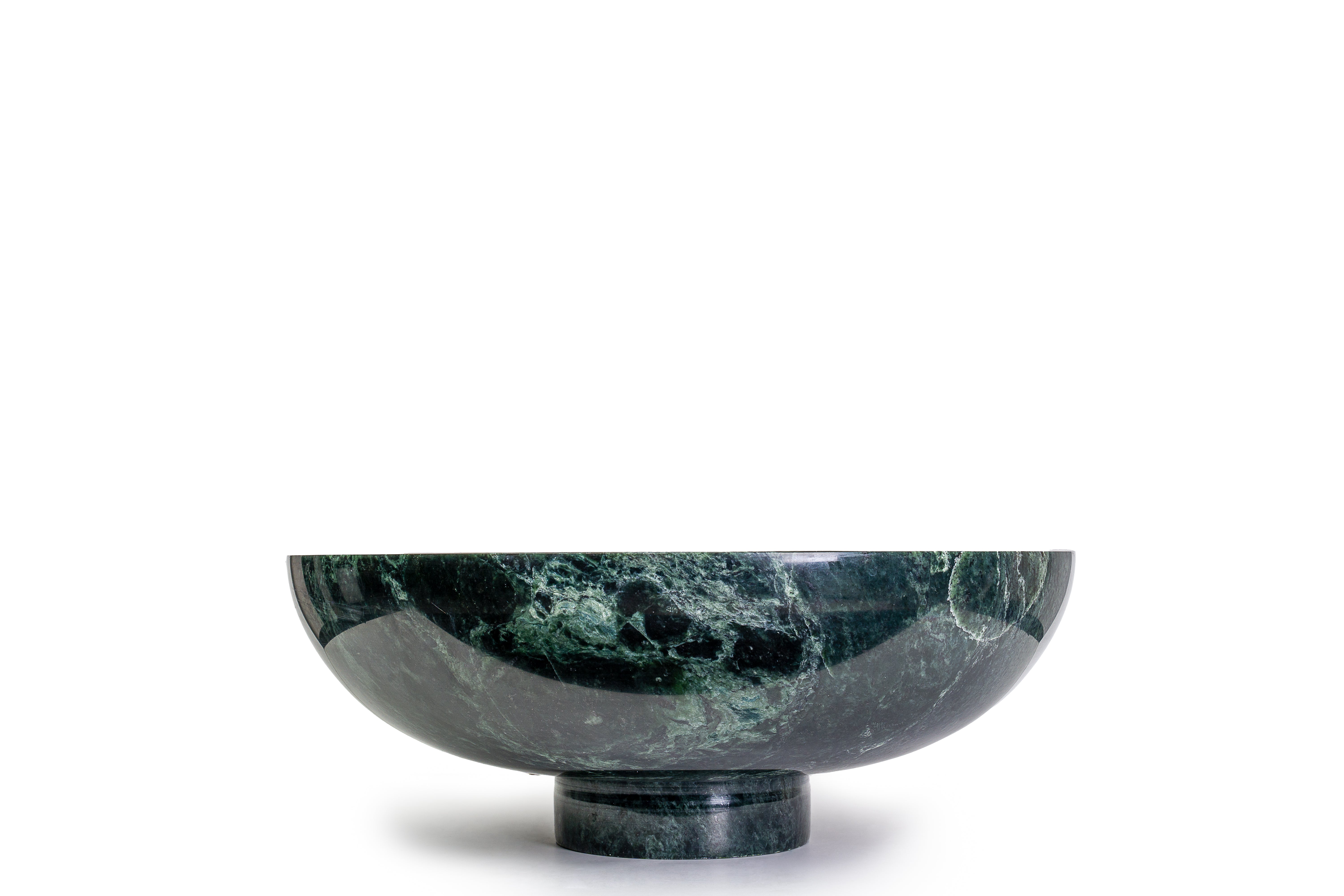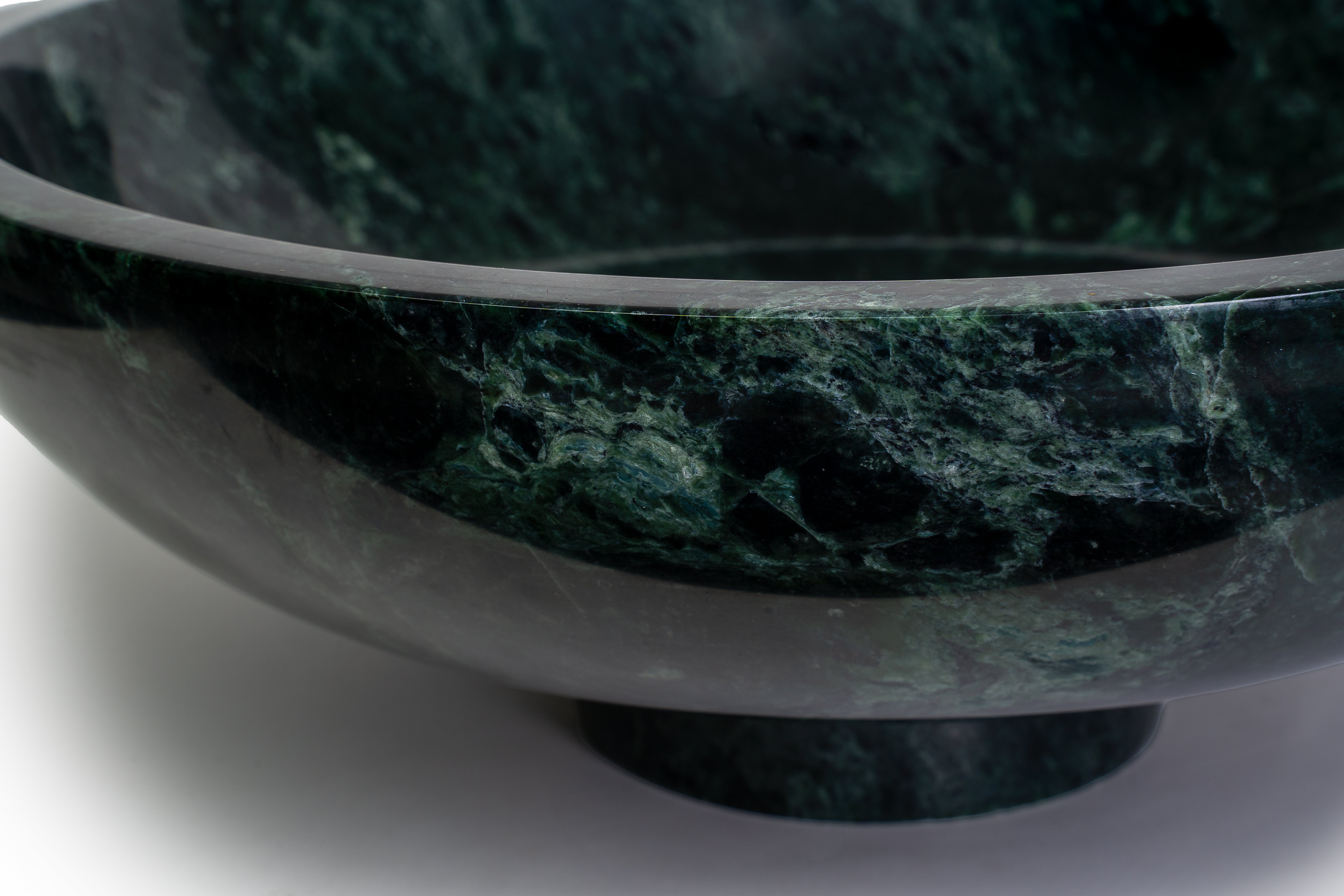 Hand-carved from richly veined green marble, this sculptural bowl brings natural drama and refined elegance to any space. Its deep, moody tones and smooth polished finish highlight the unique variations in the stone—no two pieces are ever the same. Elevated on a rounded marble base, the profile feels both modern and timeless, making it an effortless statement on a console, dining table, kitchen island, or bookshelf.