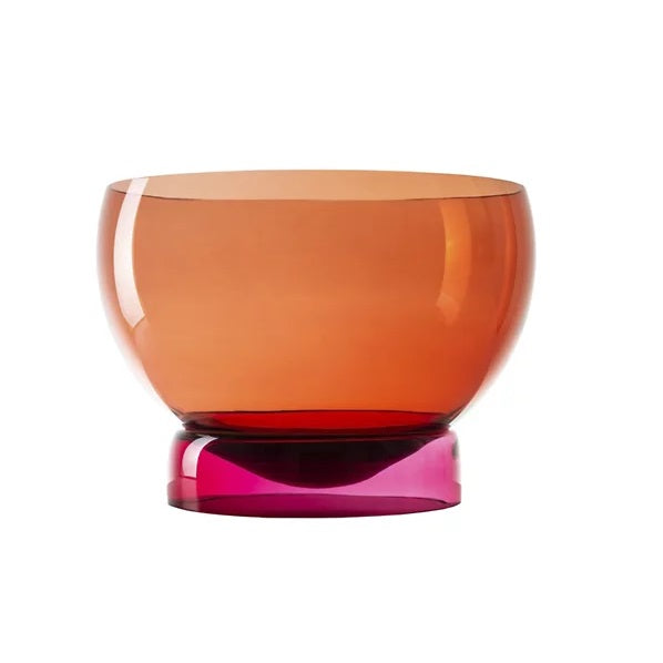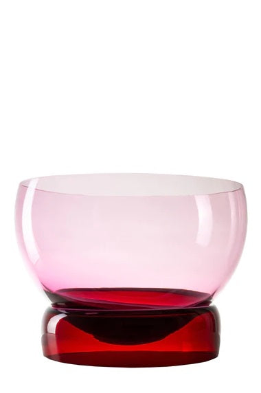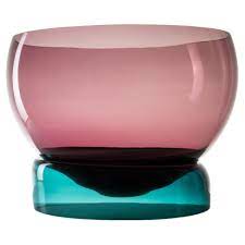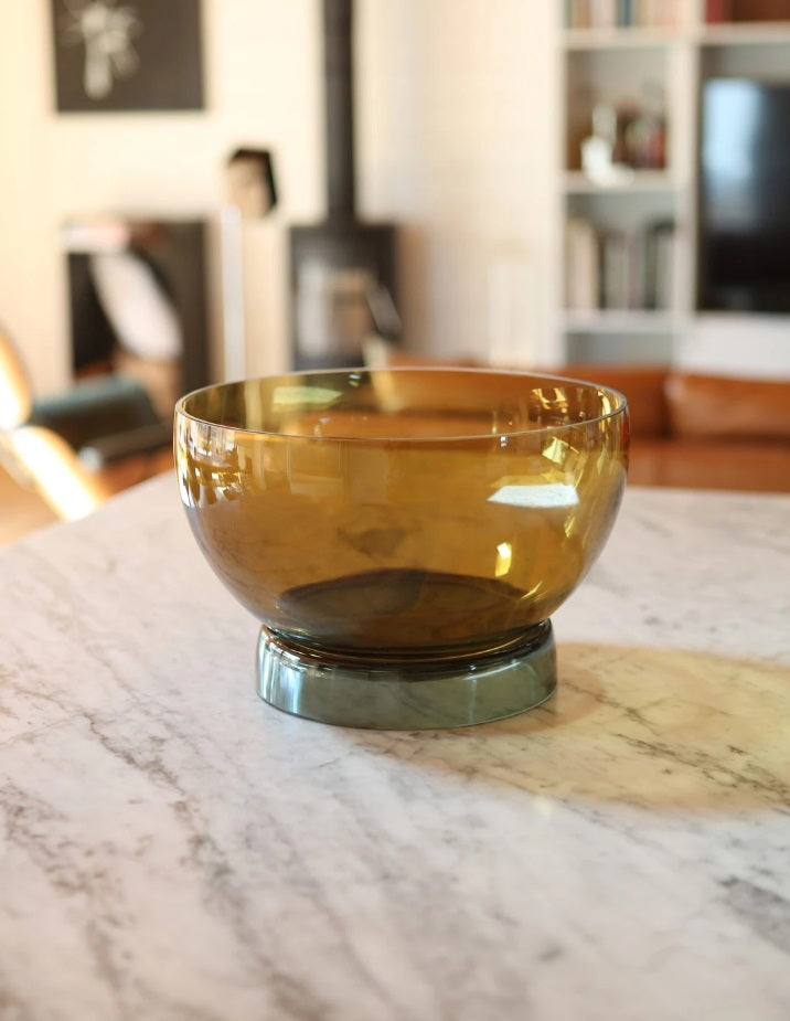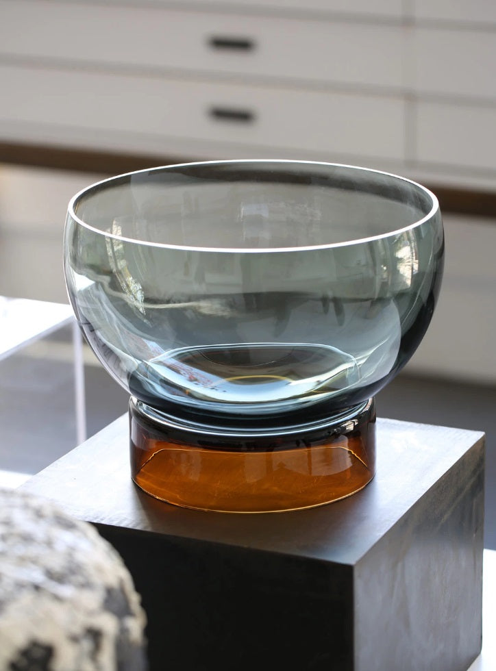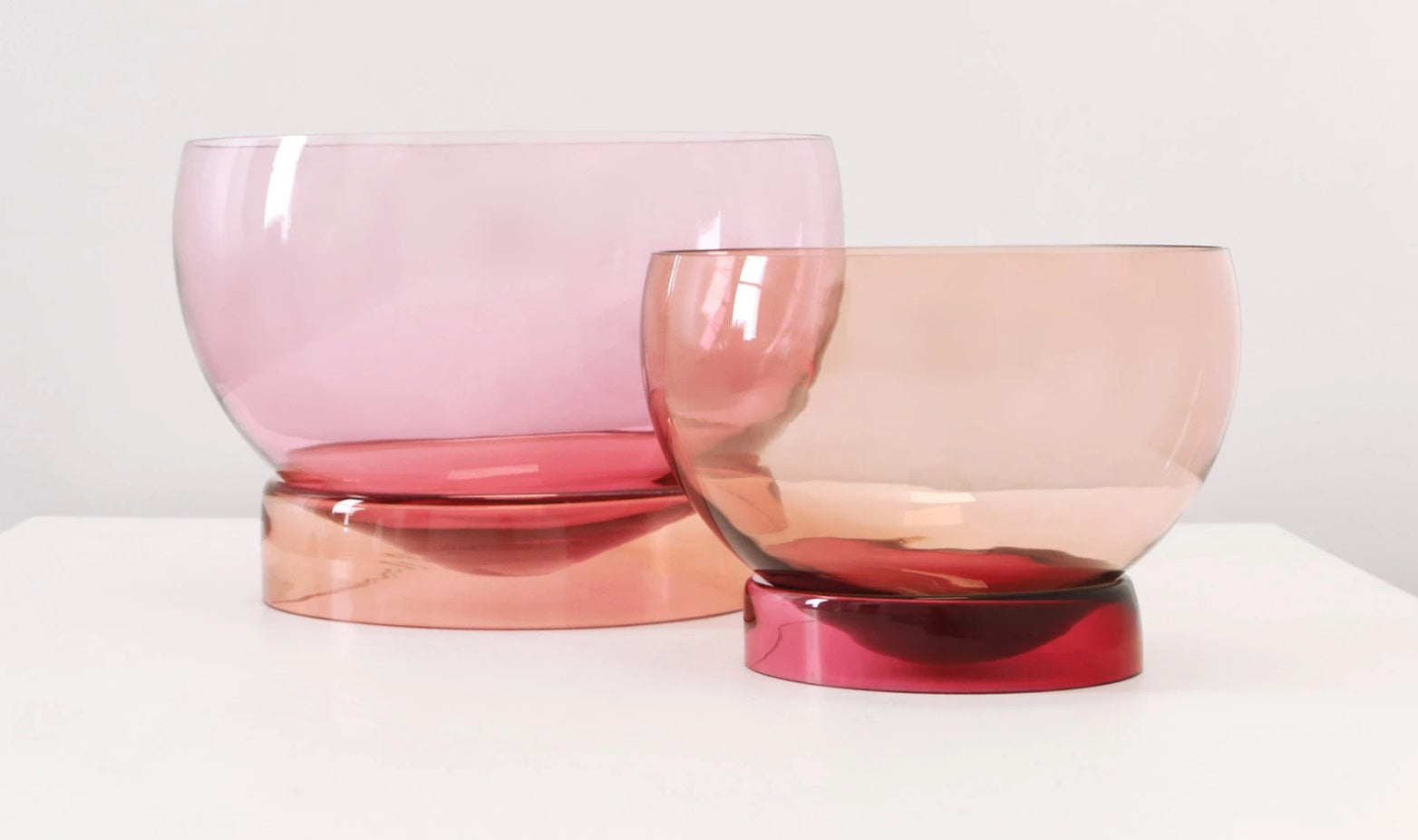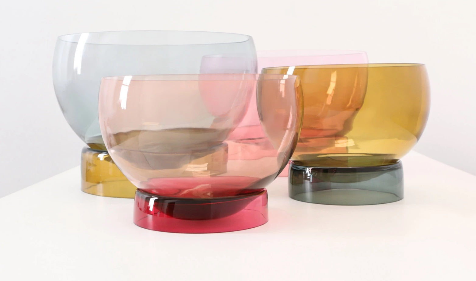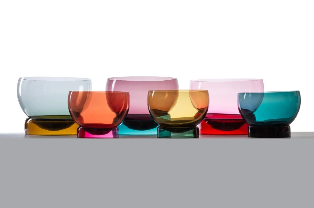 The View Bowl is created by combining two separate shapes while hot on the glass blower’s pipe. The form of the bowl is pressed against a cylindrical base, the rounded surface of the bowl pushing into the space within the cylinder. The tops and bottoms are then cut and polished. Each View Bowl is made up of two transparent colors, one for the bowl and one for the base, creating a complex color relationship.
