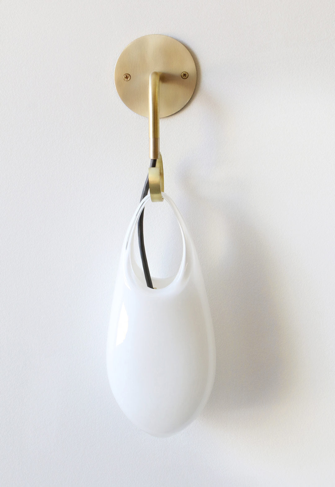 Expressive Glass Shade The sconce features a captivating glass vessel that appears to droop from its brass hook, evoking the fluidity of molten material frozen in time.