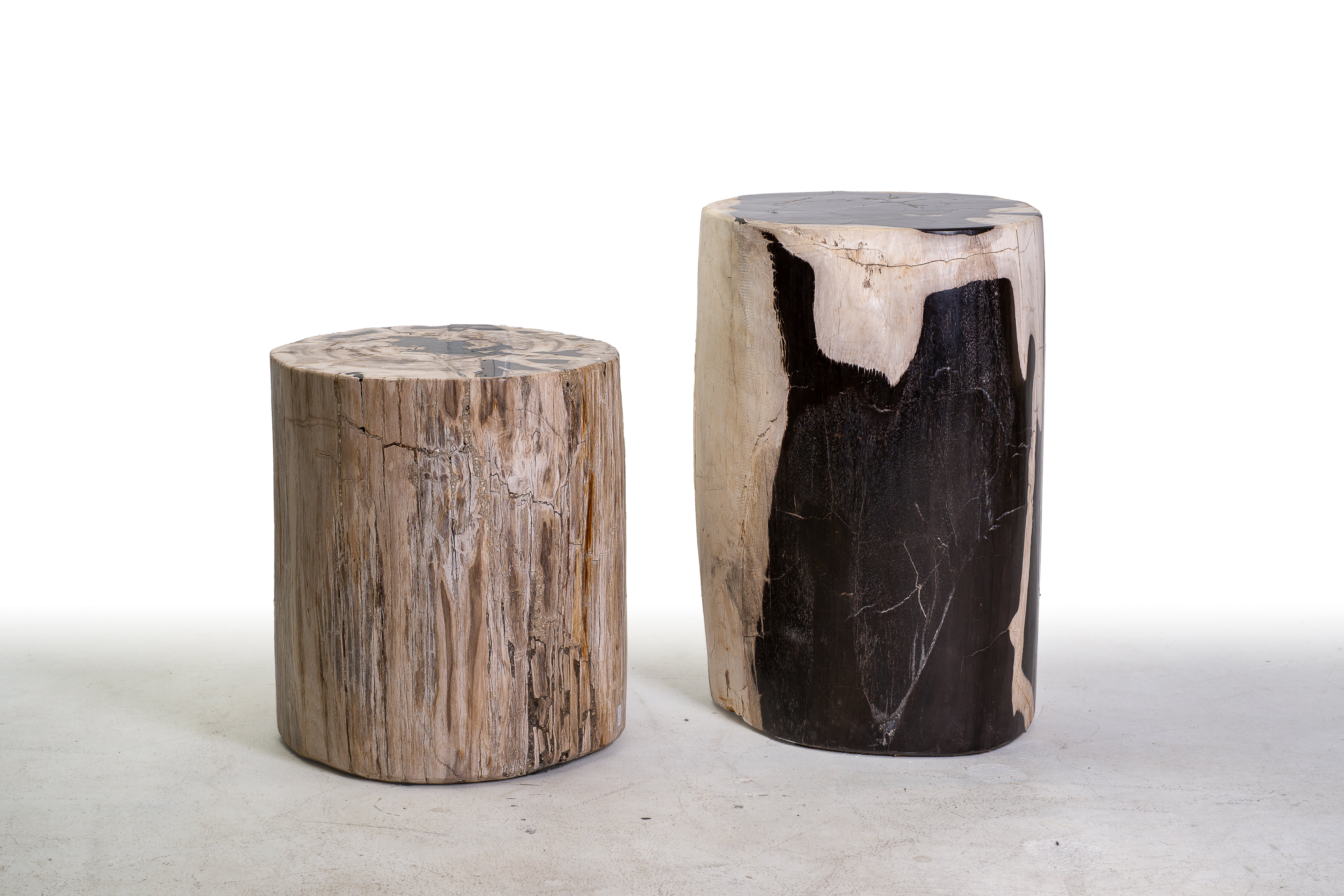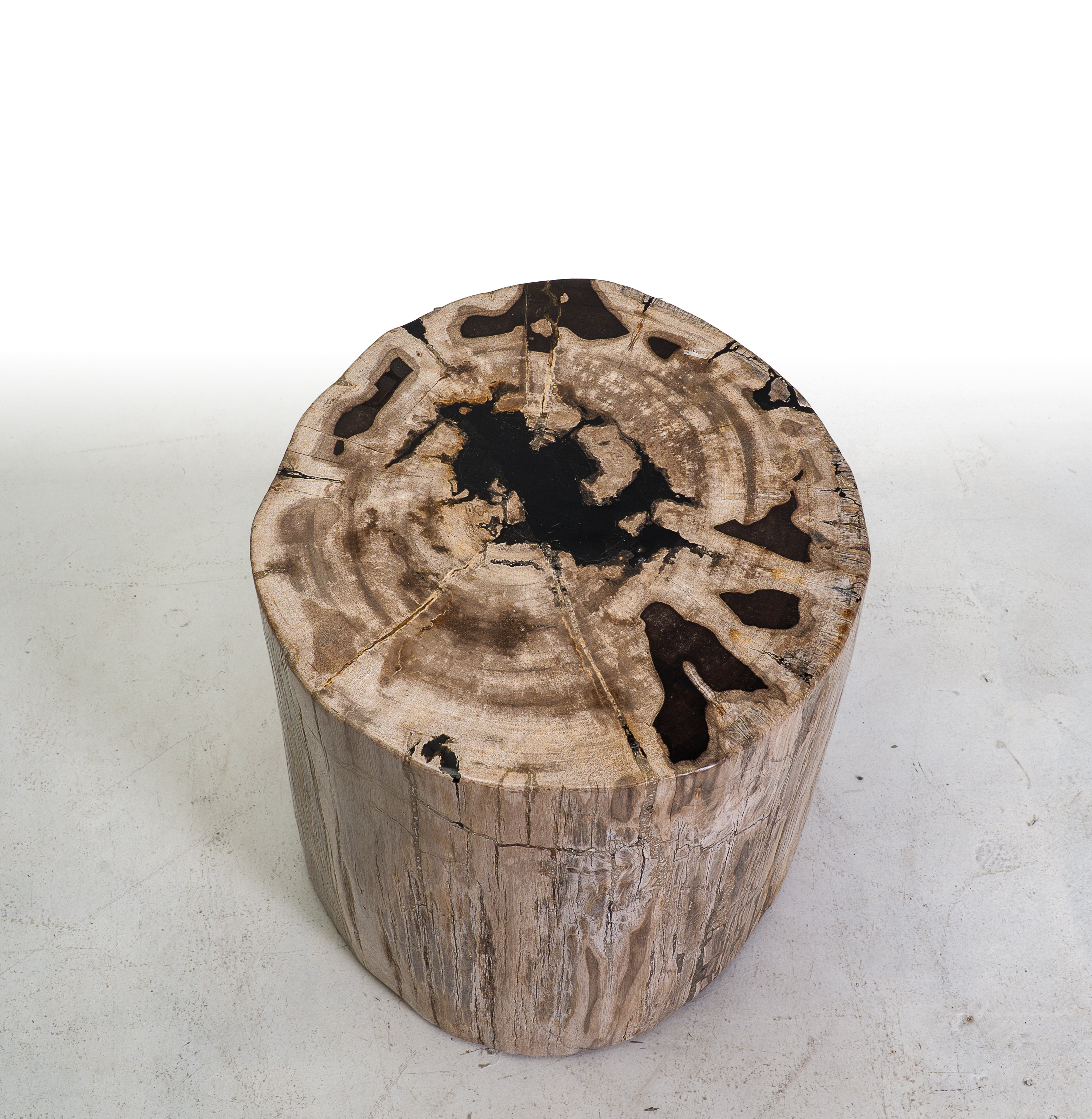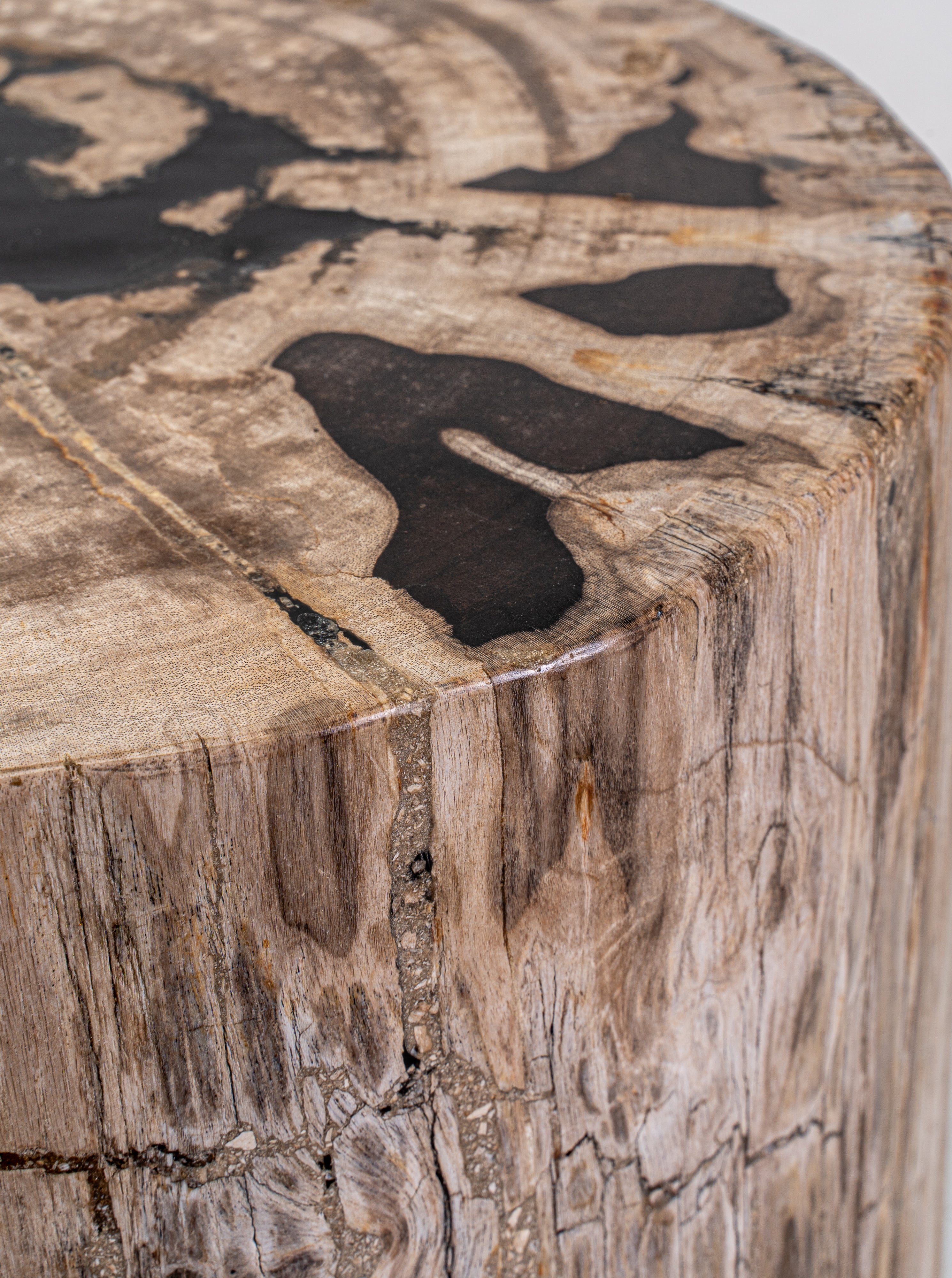 Each piece reveals a rich palette of beige, ivory, charcoal, and deep natural stone striations, making every stool completely unique. The polished finish enhances the fossilized wood’s natural character while creating a smooth, reflective surface that highlights its dramatic mineral veining.
