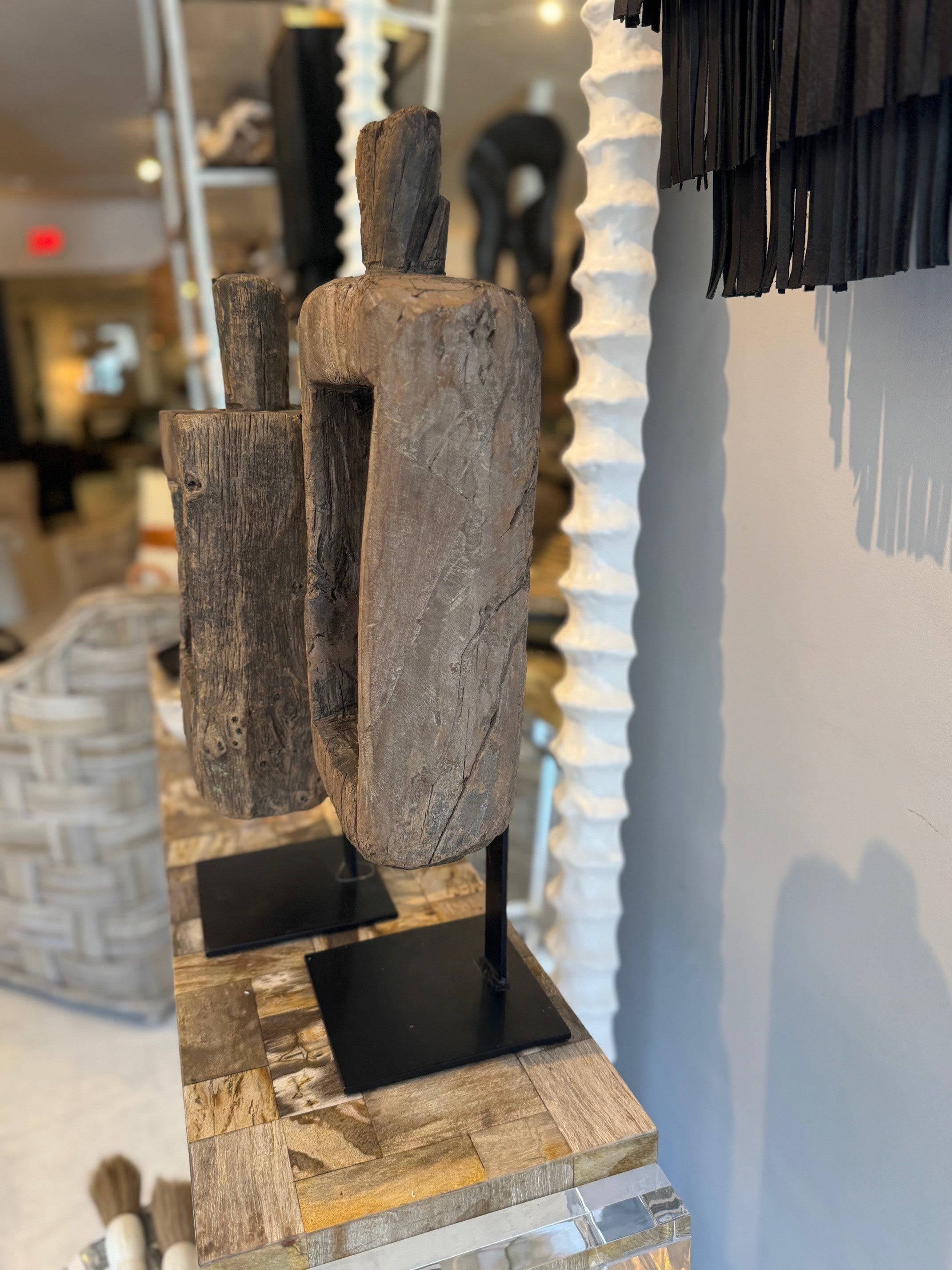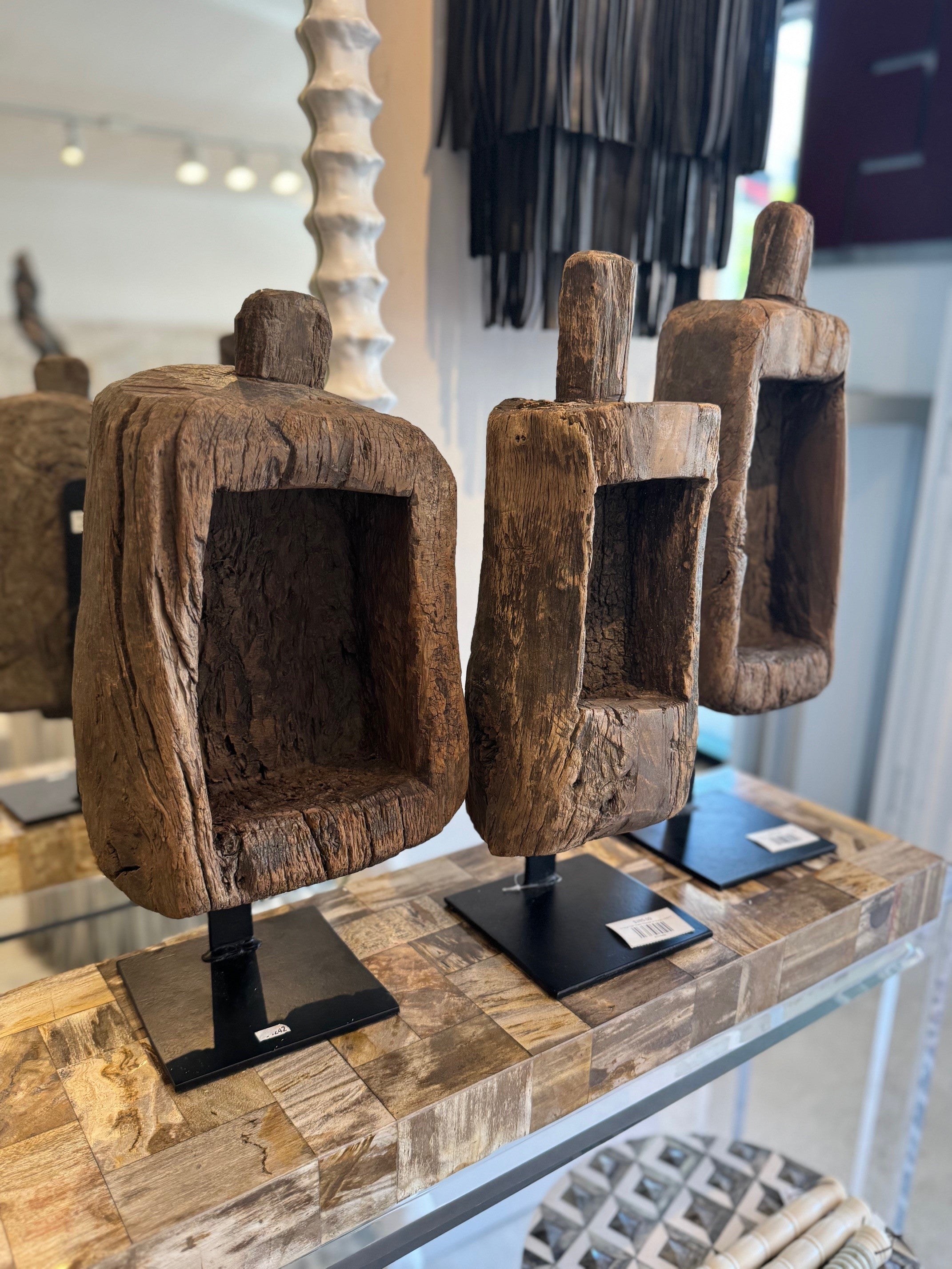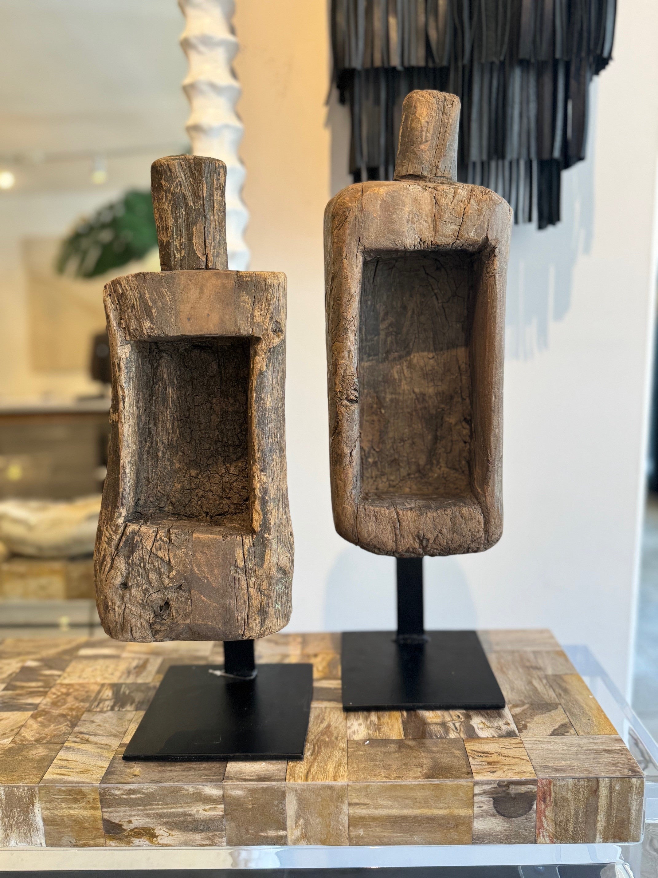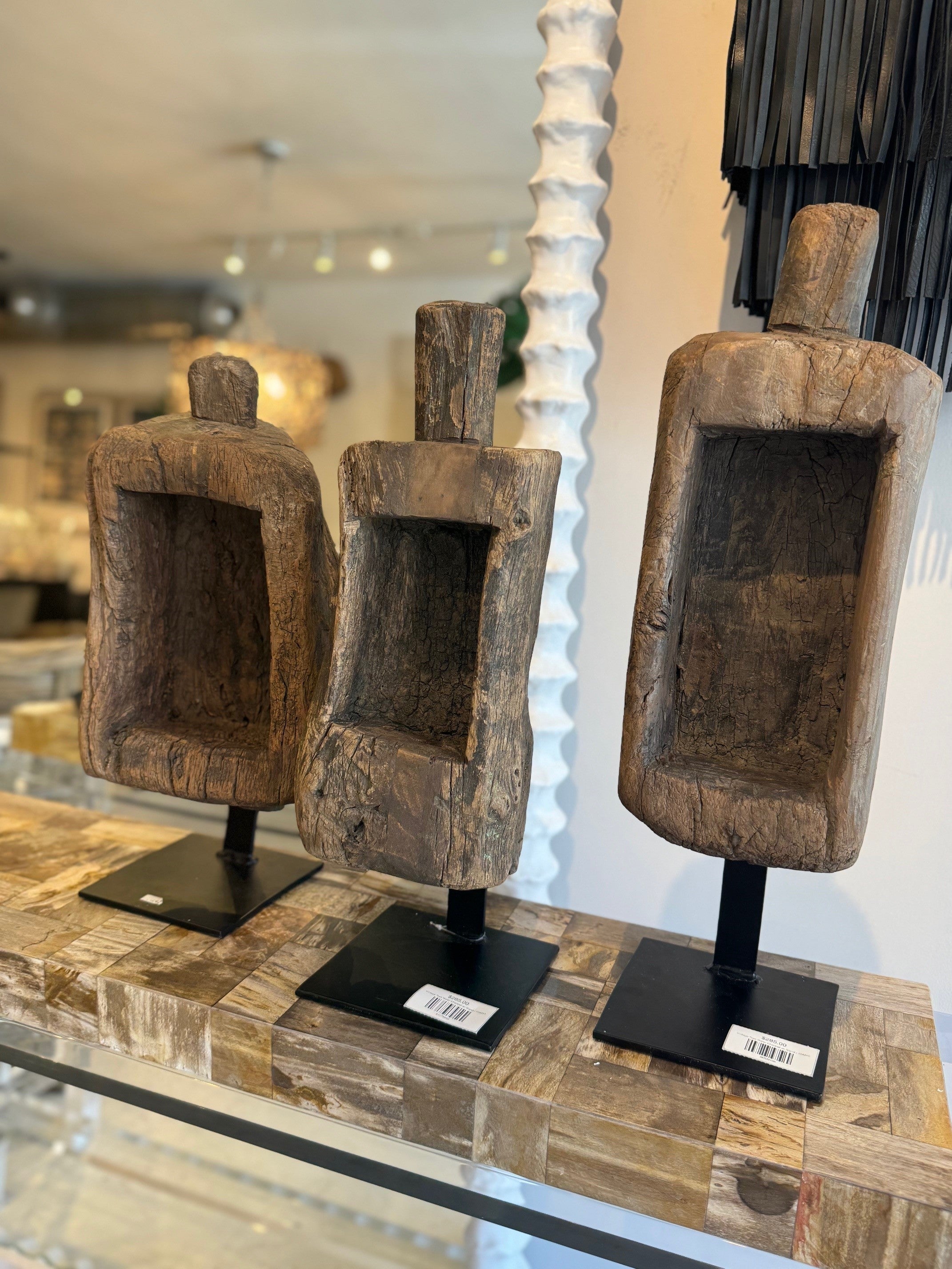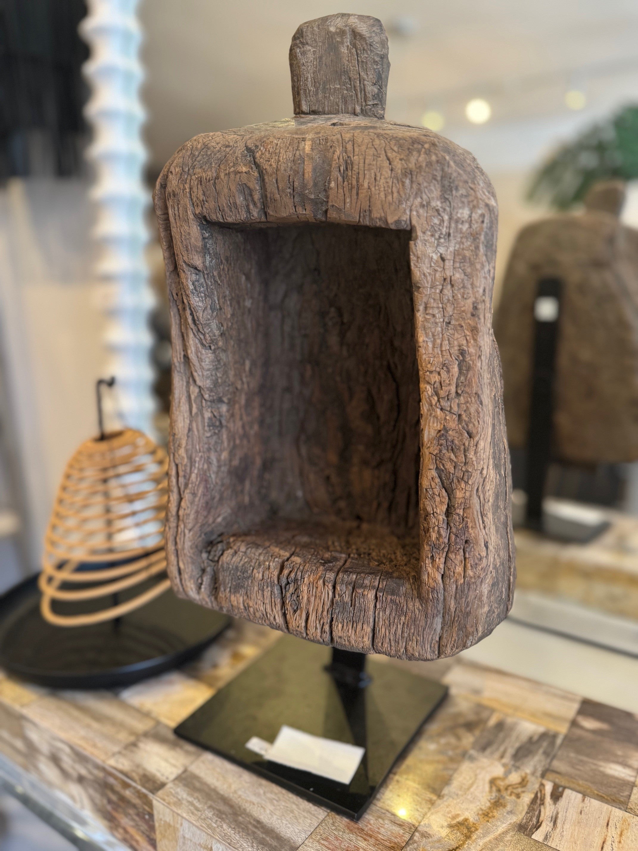 Mounted on a sleek metal base, its weathered patina, carved recess, and rich grain details evoke an earthy warmth and storied past. No two pieces are alike, making it a truly unique accent that adds soul and depth to modern, rustic, or wabi-sabi inspired interiors.
